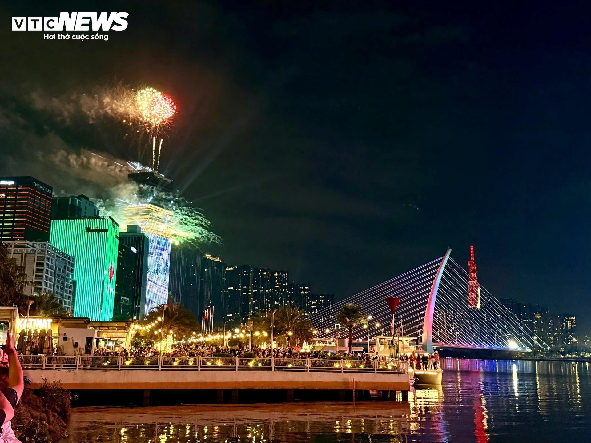 Tại Bến Bạch Đằng, hàng nghìn người dân tập trung ken đặc từ sớm. Khi pháo hoa rực sáng, cả biển người đồng loạt ngẩng đầu, nhiều tiếng reo hò vang lên đầy phấn khích.