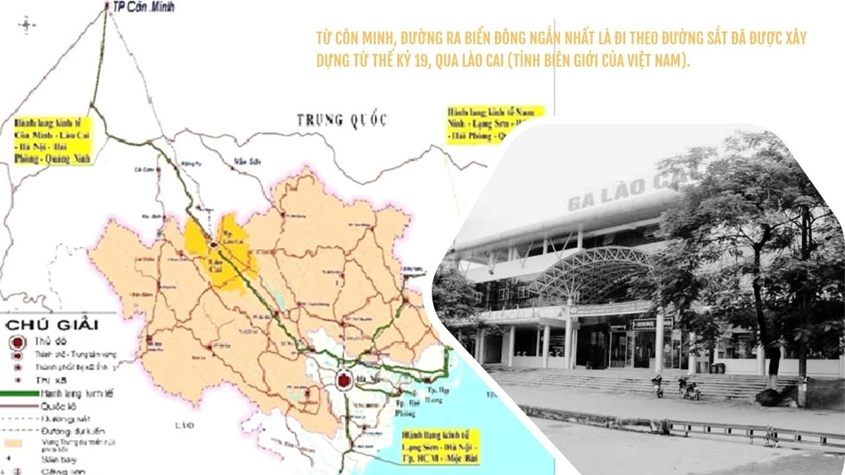Từ Côn Minh, đường ra biển Đông ngắn nhất là đi theo đường sắt đã được xây dựng từ thế kỷ 19, qua Lào Cai (tỉnh biên giới của Việt Nam) và thẳng tiến đến thành phố cảng Hải Phòng nằm trên bờ biển Vịnh Bắc Bộ. Con đường huyết mạch này là cơ sở hạ tầng thương mại vững chắc để phát triển mạnh mẽ quan hệ hợp tác toàn diện giữa hai nước láng giềng và rộng hơn là quan hệ kinh tế thương mại toàn khu vực.