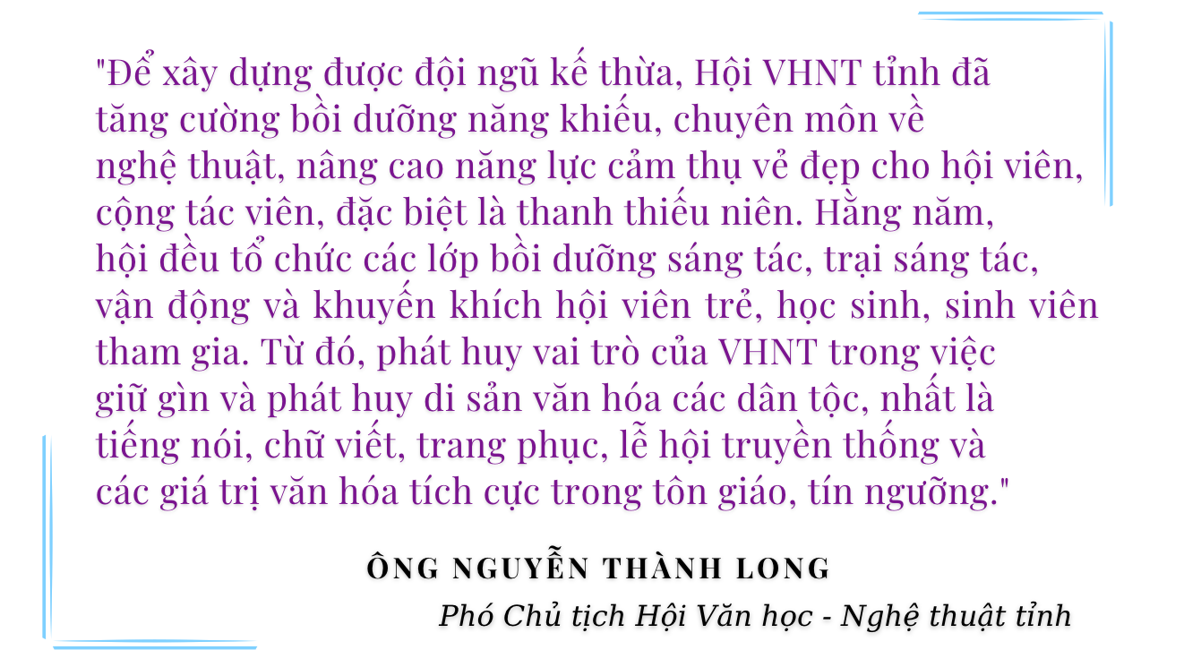 Nhiều năm qua, hội viên Hội Văn học - Nghệ thuật tỉnh là lực lượng nòng cốt trong việc sáng tạo các tác phẩm, công trình mang đậm bản sắc văn hóa các dân tộc, góp phần giữ gìn, tôn vinh và phát huy giá trị của văn hóa trong đời sống hiện đại. Trong đó, Chi hội Văn nghệ dân gian (Hội Văn học - Nghệ thuật tỉnh) sở hữu nhiều tác phẩm, công trình nghiên cứu về di sản, văn hóa dân gian các dân tộc. Hơn 30 thành viên của chi hội đều là những người rất tâm huyết, đi nhiều nơi nghiên cứu để có những công trình nghiên cứu về văn hóa, văn nghệ dân gian dày hàng trăm, hàng nghìn trang giấy. Các công trình nghiên cứu đã mang đến cho người đọc những thông tin chính xác, hữu ích, sâu rộng về các vấn đề được đề cập. Tính đến nay, hội viên của chi hội đã cho ra đời hơn 40 đầu sách là các công trình nghiên cứu sâu sắc, có ý nghĩa lớn cho công tác giữ gìn và phát huy bản sắc văn hóa dân tộc.