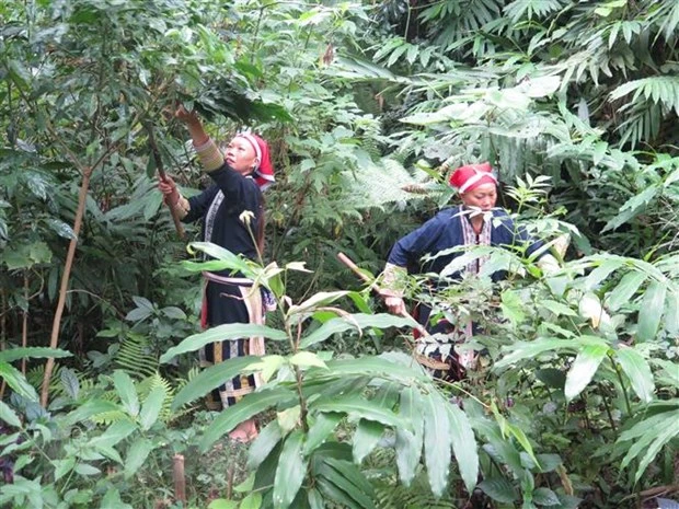 Phụ nữ dân tộc Dao lên rừng lá hái thuốc.