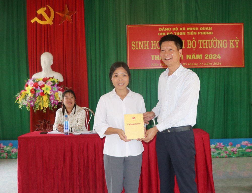 Đồng chí yêu cầu Chi bộ trước mắt tổ chức chuẩn bị tốt cho Ngày hội Đại đoàn kết toàn dân và Đại hội Chi bộ khóa XVII, nhiệm kỳ 2025 – 2027. Nhân dịp này, đồng chí Phó Chủ tịch Thường trực UBND tỉnh và lãnh đạo huyện Trấn Yên đã tặng quà hỗ trợ người dân thôn Tiền Phong, xã Minh Quân khắc phục khó khăn sau bão số 3.