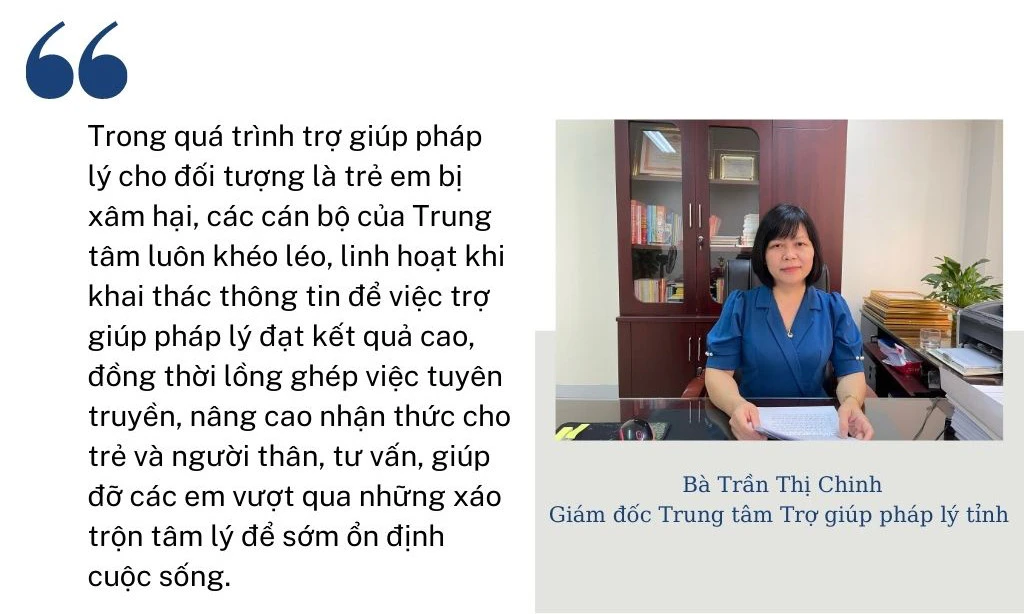 Luật Trợ giúp pháp lý năm 2017 quy định trẻ em là một trong những đối tượng được trợ giúp pháp lý. Bà Trần Thị Chinh, Giám đốc Trung tâm Trợ giúp pháp lý tỉnh cho biết: Năm 2021, trung tâm trợ giúp cho 11 trẻ; từ đầu năm đến nay, có 12 trẻ được trợ giúp pháp lý; phần lớn trong số này là trẻ em bị xâm hại tình dục. Trong quá trình trợ giúp pháp lý cho đối tượng là trẻ em bị xâm hại, các cán bộ của trung tâm luôn khéo léo, linh hoạt khi khai thác thông tin để việc trợ giúp pháp lý đạt kết quả cao, đồng thời lồng ghép việc tuyên truyền, nâng cao nhận thức cho trẻ và người thân, tư vấn, giúp đỡ các em vượt qua những xáo trộn tâm lý để sớm ổn định cuộc sống.