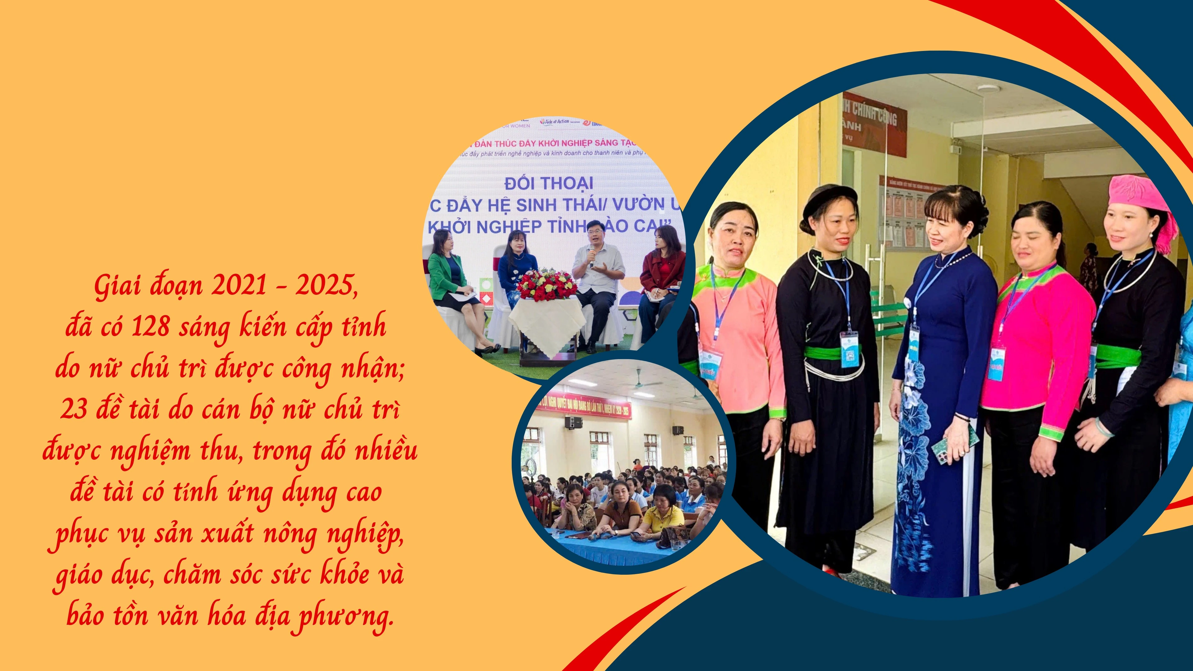 Giai đoạn 2021 - 2025, đã có 128 sáng kiến cấp tỉnh do nữ chủ trì được công nhận; 23 đề tài do cán bộ nữ chủ trì được nghiệm thu, trong đó nhiều đề tài có tính ứng dụng cao phục vụ sản xuất nông nghiệp, giáo dục, chăm sóc sức khỏe và bảo tồn văn hóa địa phương.