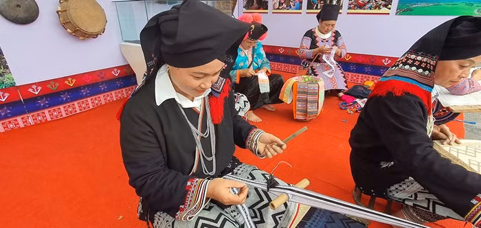 Phụ nữ người Dao đang sản xuất hàng thổ cẩm.