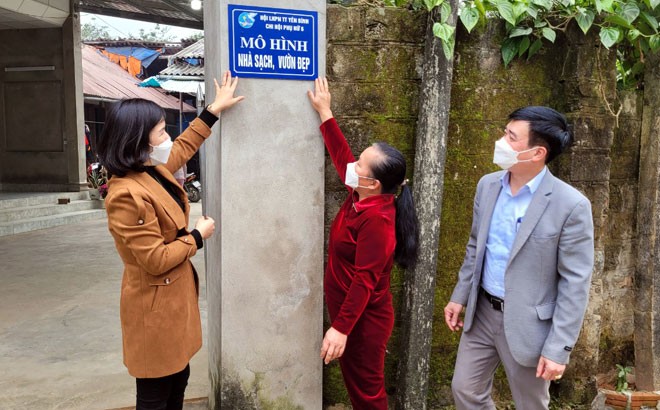 Hội Phụ nữ thị trấn Yên Bình, huyện Yên Bình trao biển Mô hình nhà sạch vườn đẹp cho các hộ hội viên.
