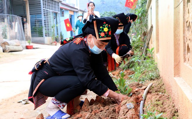 Hội viên Phụ nữ xã Đại Sơn, huyện Văn Yên trồng đoạn đường hoa.