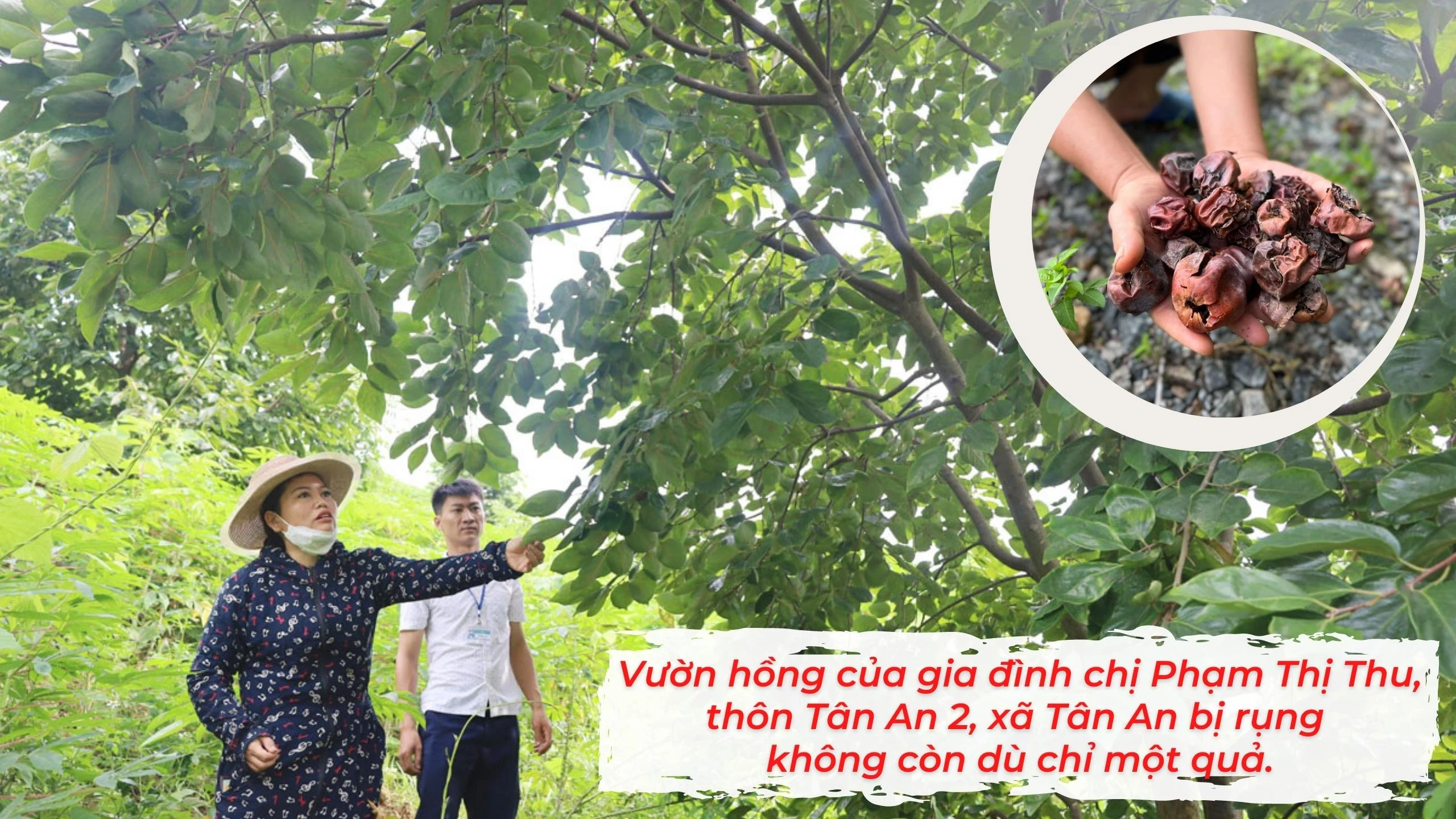 Còn hơn 10 ha cây hồng của gia đình chị Phạm Thị Thu, thôn Tân An 2 đã bị rụng hết không còn quả. Dẫn chúng tôi đi thăm vườn, chị Thu buồn rầu: Hơn 600 gốc hồng gia đình trồng từ năm 2010, đã thu hoạch được 3 năm, năm ngoái thu hơn 2 tấn quả. Năm nay dự kiến sản lượng tăng gấp đôi theo chu kỳ sinh trưởng, sẽ có khoản thu lớn từ cây hồng để chi trả khoản vay ngân hàng và thanh toán tiền nhân công chăm sóc. Nhưng vào thời điểm tháng 6 âm lịch, bỗng nhiên hồng bị rụng quả, chỉ trong 1 tuần trên cây không còn lấy một quả. Vợ chồng tôi chỉ còn biết ôm gốc hồng mà khóc.