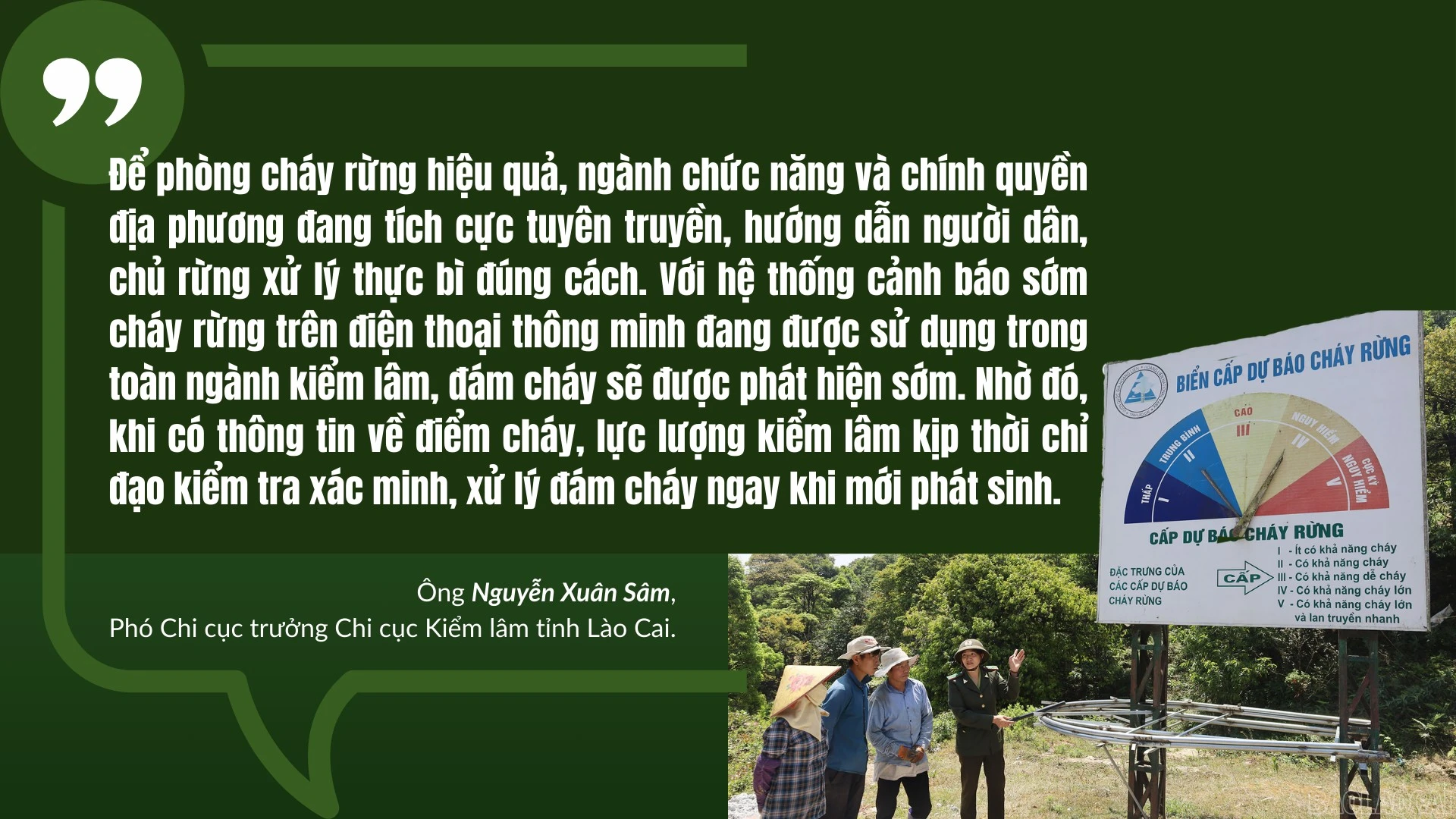 Ông Giàng A Cấu, Tổ trưởng Tổ bảo vệ rừng thôn Séo Mý Tỷ chia sẻ: Tổ có nhiệm vụ cùng cán bộ kiểm lâm bảo vệ hơn 700 ha rừng đặc dụng thuộc Vườn Quốc gia Hoàng Liên. Để phòng chống cháy rừng mùa khô hanh, nhất là mùa làm nương, các thành viên trong tổ phân công đi tuần tra, kiểm soát bảo vệ rừng, kịp thời phát hiện những trường hợp dọn nương thảo quả, dọn khu vực ven rừng để trồng ngô, người dân vào rừng dùng lửa lấy mật ong không đảm bảo an toàn phòng cháy. Khu vực giáp ranh tỉnh Lai Châu được tăng cường tuần tra vì là bãi chăn thả gia súc, có tình trạng người dân sử dụng lửa đốt cây bụi cho cỏ mọc, nguy cơ cháy lan vào rừng cao.