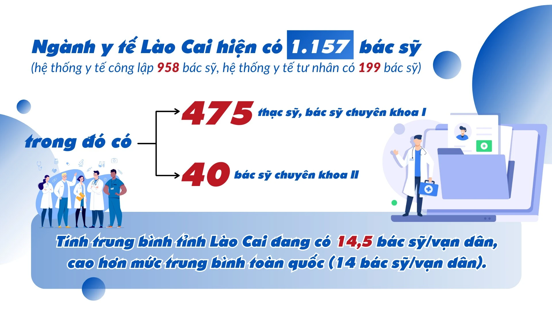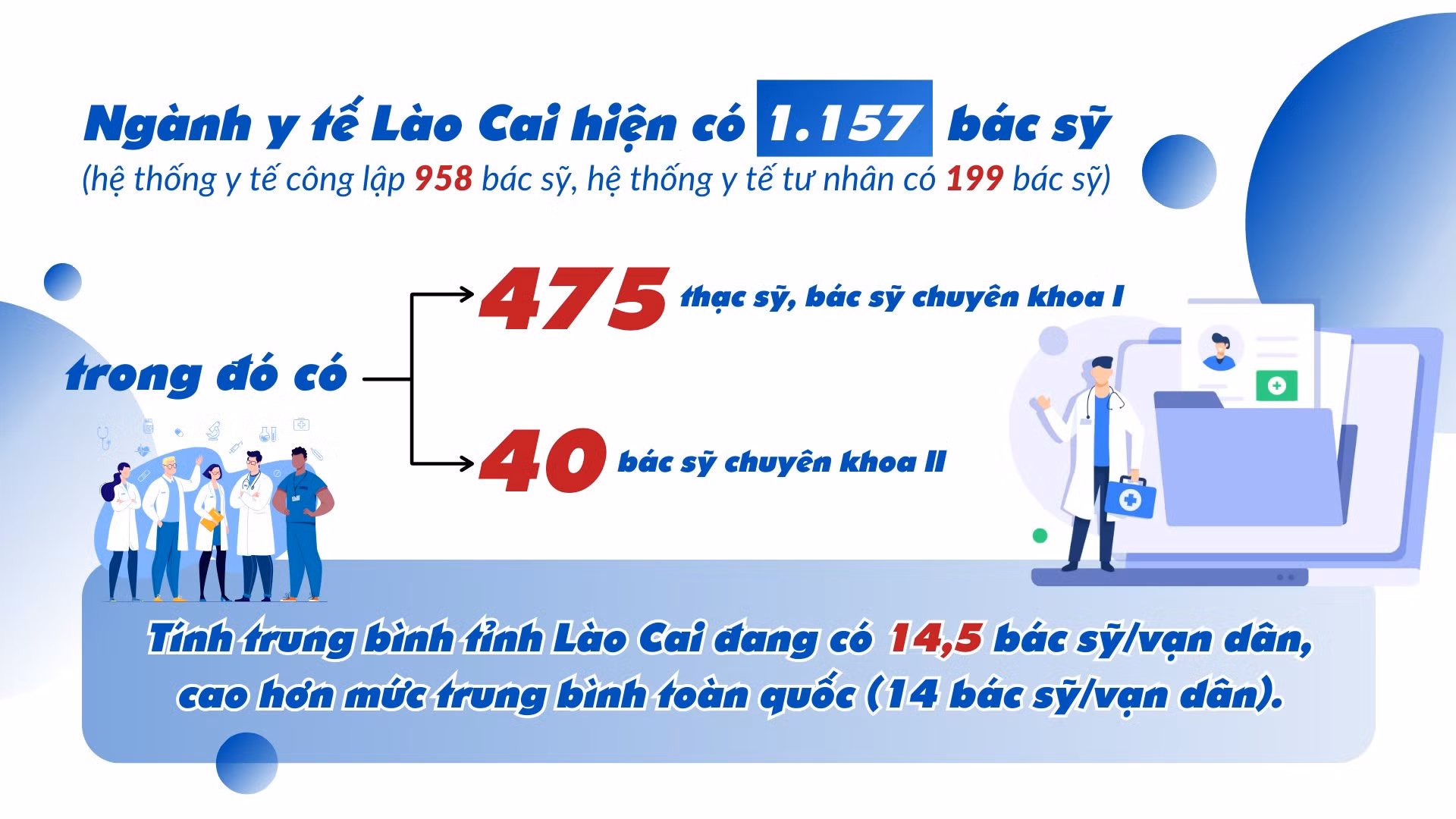 Về chủ trương lãnh đạo, nhằm cụ thể hóa Nghị quyết Đại hội Đảng bộ tỉnh Lào Cai lần thứ XVI, nhiệm kỳ 2020 - 2025, ngày 11/12/2020, Ban Chấp hành Đảng bộ tỉnh đã ban hành Đề án 07-ĐA/TU về “Bảo vệ, chăm sóc, nâng cao sức khỏe Nhân dân và công tác dân số tỉnh Lào Cai trong tình hình mới, giai đoạn 2020 - 2025”, trong đó nhiệm vụ nâng cao chất lượng nguồn nhân lực cho ngành y tế là nhiệm vụ trọng tâm, cốt yếu. Ngoài ra, từ năm 2020 đến nay, Tỉnh ủy, HĐND, UBND tỉnh còn ban hành nhiều chỉ thị, nghị quyết, chính sách, kế hoạch về xây dựng, phát triển ngành y tế, về nâng cao trình độ, năng lực đội ngũ, nêu cao y đức; bố trí nguồn lực thỏa đáng để đầu tư phát triển sự nghiệp y tế tỉnh. Điển hình là Nghị quyết 11/2020/NQ-HĐND của HĐND tỉnh Lào Cai về chính sách thu hút, đãi ngộ, hỗ trợ đào tạo nguồn nhân lực tỉnh Lào Cai giai đoạn 2021 - 2025. Xuất phát điểm là địa phương thiếu trầm trọng nguồn nhân lực, nhất là nguồn nhân lực chất lượng cao, nhờ các chính sách quan tâm đào tạo, bồi dưỡng, thu hút, đến nay ngành y tế Lào Cai đã có 1.157 bác sỹ (trong đó có 475 thạc sỹ, bác sỹ chuyên khoa I và 40 bác sỹ chuyên khoa II), tăng 2 lần so với năm 2015. Tính trung bình tỉnh Lào Cai đang có 14,5 bác sỹ/vạn dân, cao hơn mức trung bình toàn quốc (14 bác sỹ/vạn dân).