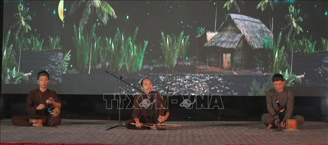 Tiết mục "Dạt nước cánh bèo", biểu diễn Bùi Công Sơn, tại lễ Tổng kết và trao giải Liên hoan hát Xẩm Ninh Bình mở rộng năm 2023. Ảnh: Thùy Dung/TTXVN