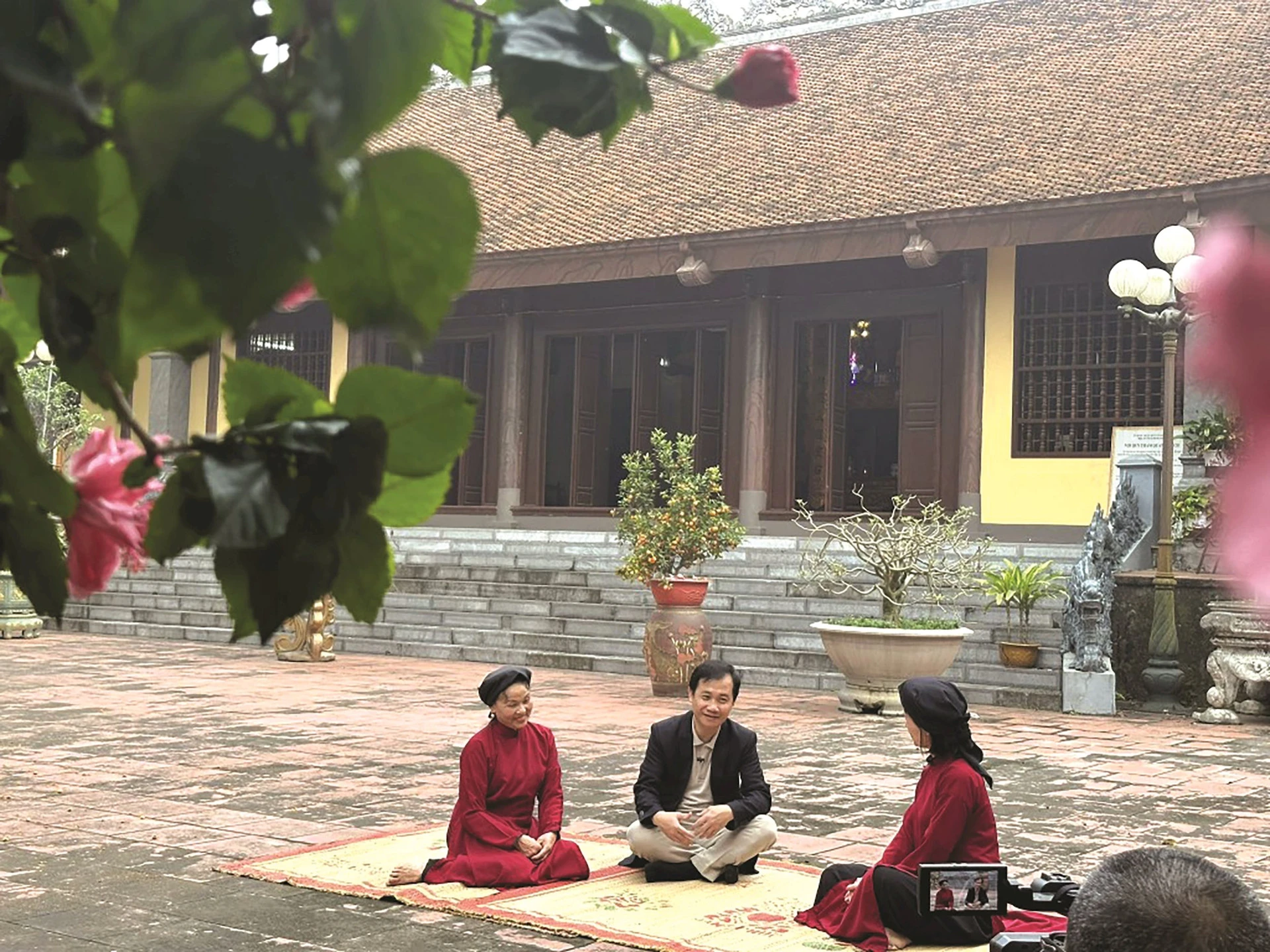 Nhà nghiên cứu âm nhạc Nguyễn Quang Long (giữa) trò chuyện với các nghệ nhân phường Xoan Thét (Việt Trì, Phú Thọ) để ghi hình thực hiện dự án “Giới thiệu di sản âm nhạc hát Xoan” trên YouTube.