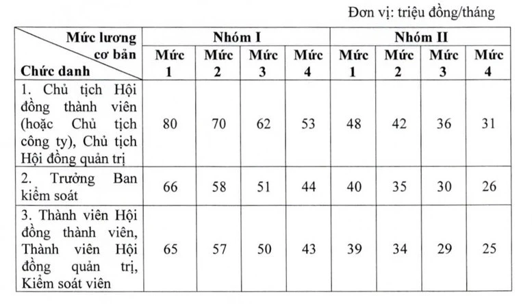 Tiền lương của Ban điều hành được trả theo chức danh, chức vụ và kết quả sản xuất, kinh doanh, trong đó mức tiền lương của Tổng giám đốc, Giám đốc (trừ trường hợp Tổng giám đốc, Giám đốc được thuê làm việc theo hợp đồng lao động) tối đa không vượt quá 10 lần so với mức tiền lương bình quân của người lao động.