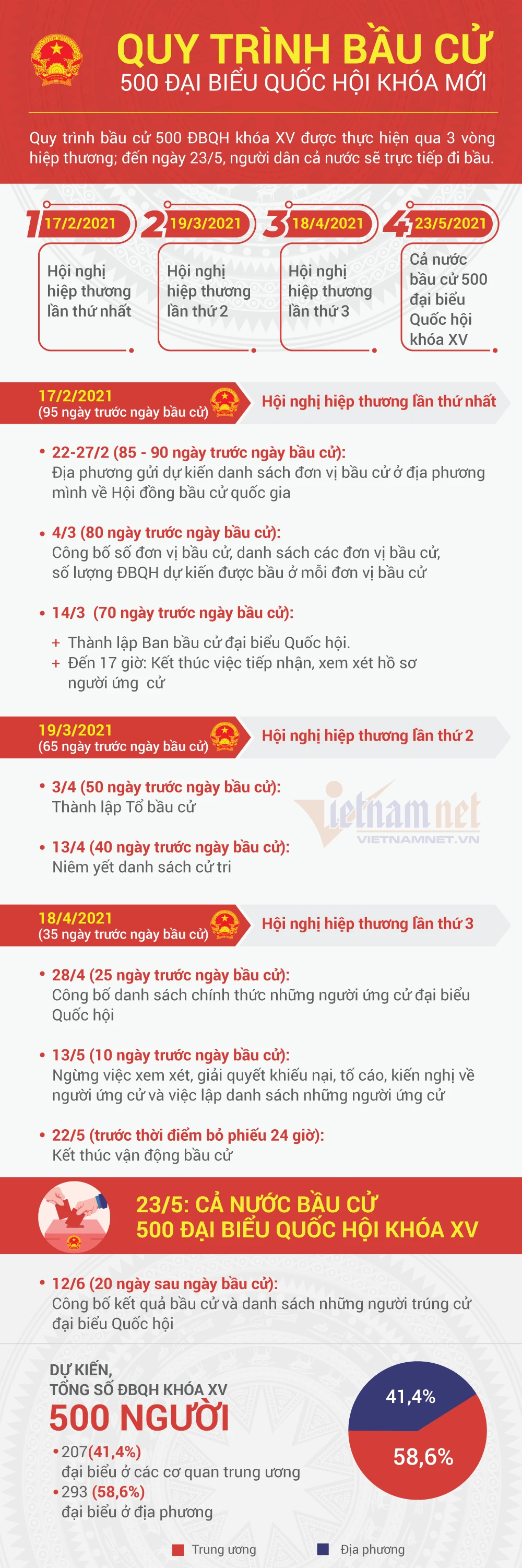 Quy trình bầu cử 500 đại biểu Quốc hội khóa XV được thực hiện qua 3 vòng hiệp thương. Sau đó, ngày 23/5, người dân cả nước sẽ trực tiếp đi bầu.