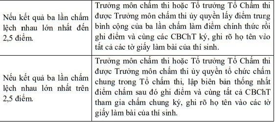 Cán bộ chấm thi lần thứ hai ghi điểm chấm trực tiếp vào bài thi của thí sinh (điểm chấm từng ý nhỏ phải ghi tại lề bên trái bài thi ngay cạnh ý được chấm) và vào phiếu chấm.