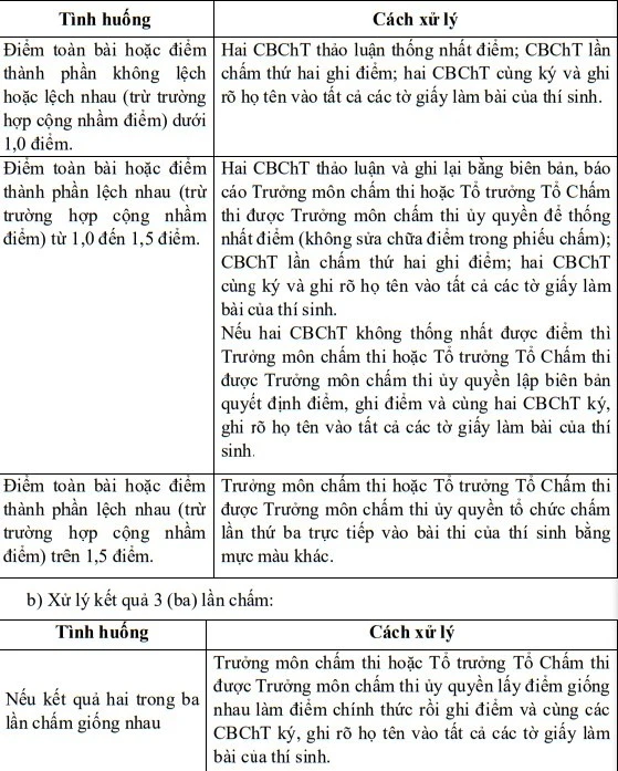Trong trường hợp phát hiện bài thi không đủ số tờ, số phách; bài thi làm trên giấy nháp; bài thi làm trên giấy khác với giấy dùng cho kỳ thi; bài thi có chữ viết của hai người trở lên, viết bằng hai màu mực khác nhau trở lên, viết bằng mực đỏ, bút chì hoặc có viết, vẽ những nội dung không liên quan nội dung thi; bài thi nhàu nát hoặc nghi vấn có đánh dấu, cán bộ chấm thi có trách nhiệm báo cáo và giao những bài thi này cho tổ trưởng chấm thi trình trưởng môn chấm thi xử lý.