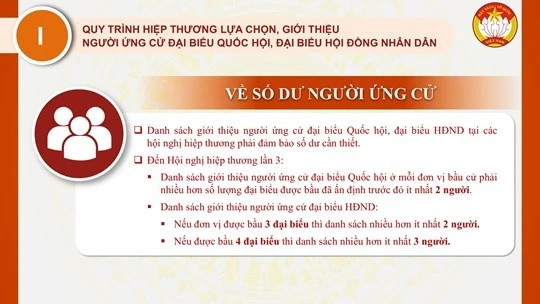 Trong đó, đến Hội nghị hiệp thương lần thứ ba, danh sách giới thiệu người ứng cử đại biểu Quốc hội phải bảo đảm có số dư lớn hơn số dư theo quy định, cụ thể là: “Số người trong danh sách ứng cử đại biểuQuốc hộiở mỗi đơn vị bầu cử phải nhiều hơn số lượng đại biểu được bầu đã ấn định cho đơn vị bầu cử đóít nhất là hai người” (Khoản 6 Điều 57 Luật bầu cử đại biểu Quốc hội và đại biểu Hội đồng nhân dân); danh sách giới thiệu người ứng cử đại biểu Hội đồng nhân dân“nếu đơn vị bầu cử được bầuba đại biểuthì số người trong danh sách ứng cử phải nhiều hơn số lượng đại biểu được bầuít nhất là hai người; nếu đơn vị bầu cử được bầu từ bốn đại biểu trở lên thì số người trong danh sách ứng cử phải nhiều hơn số lượng đại biểu được bầuít nhất là ba người”(Khoản 3 Điều 58 Luật bầu cử đại biểu Quốc hội và đại biểu Hội đồng nhân dân).