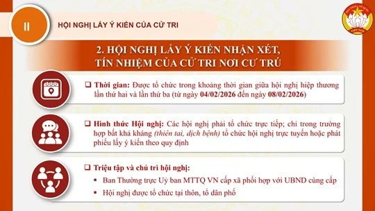 Nội dung trọng tâm thứ hai mà Phó Chủ tịch - Tổng Thư ký Nguyễn Thị Thu Hà lưu ý là việc tổ chức hội nghị giới thiệu người ứng cử tại cơ quan, tổ chức, đơn vị và hội nghị lấy ý kiến nhận xét, tín nhiệm của cử tri nơi cư trú.