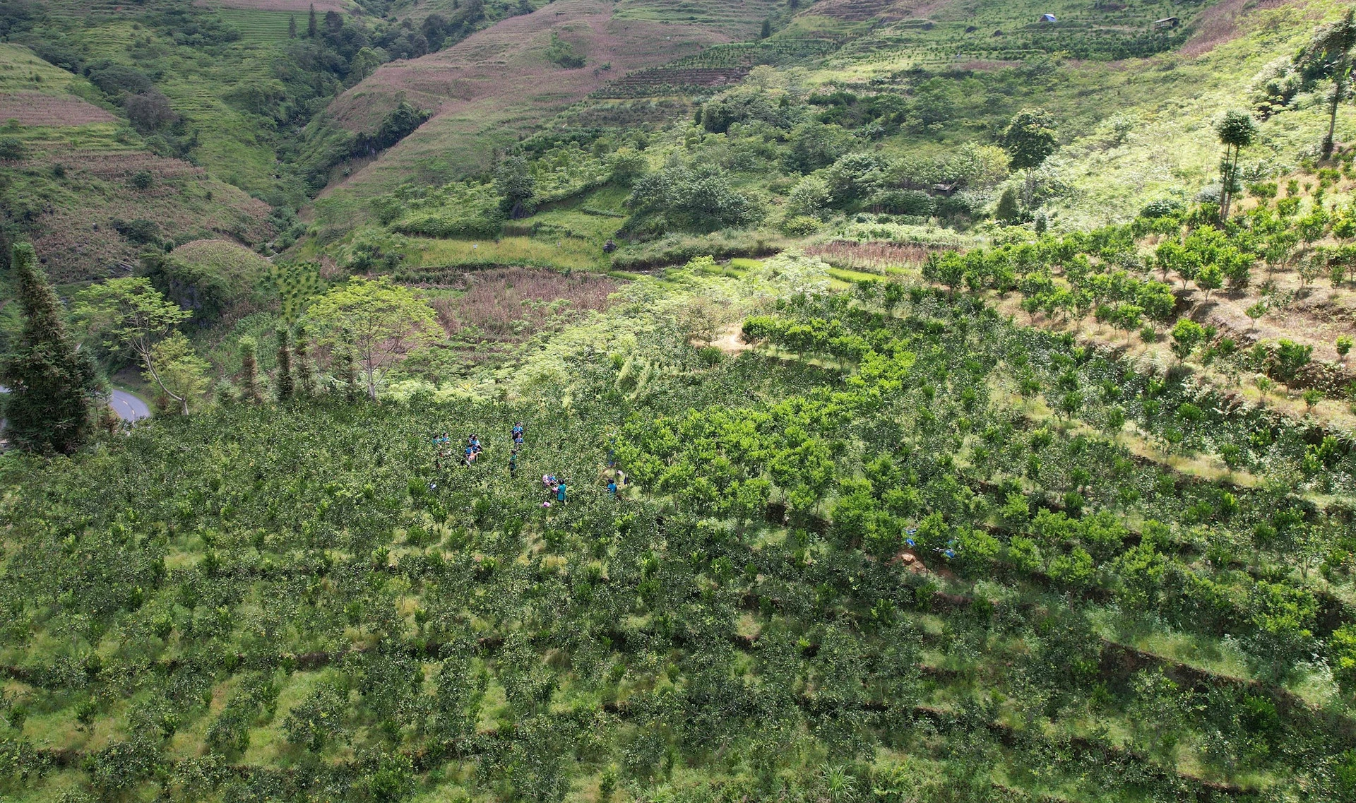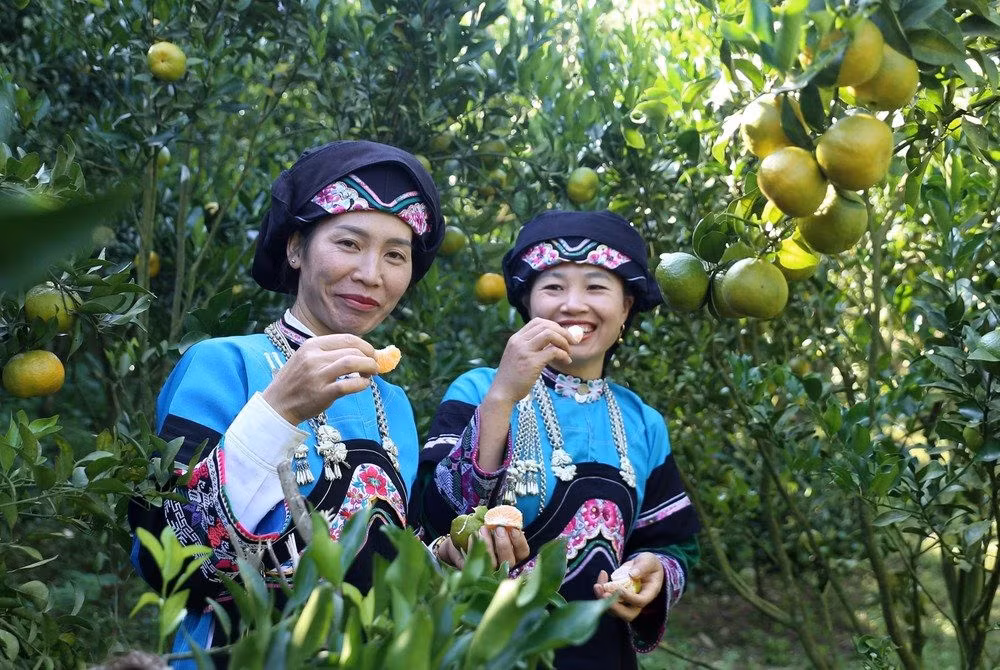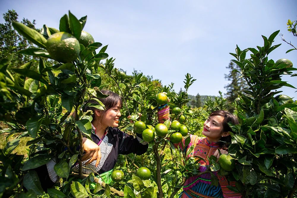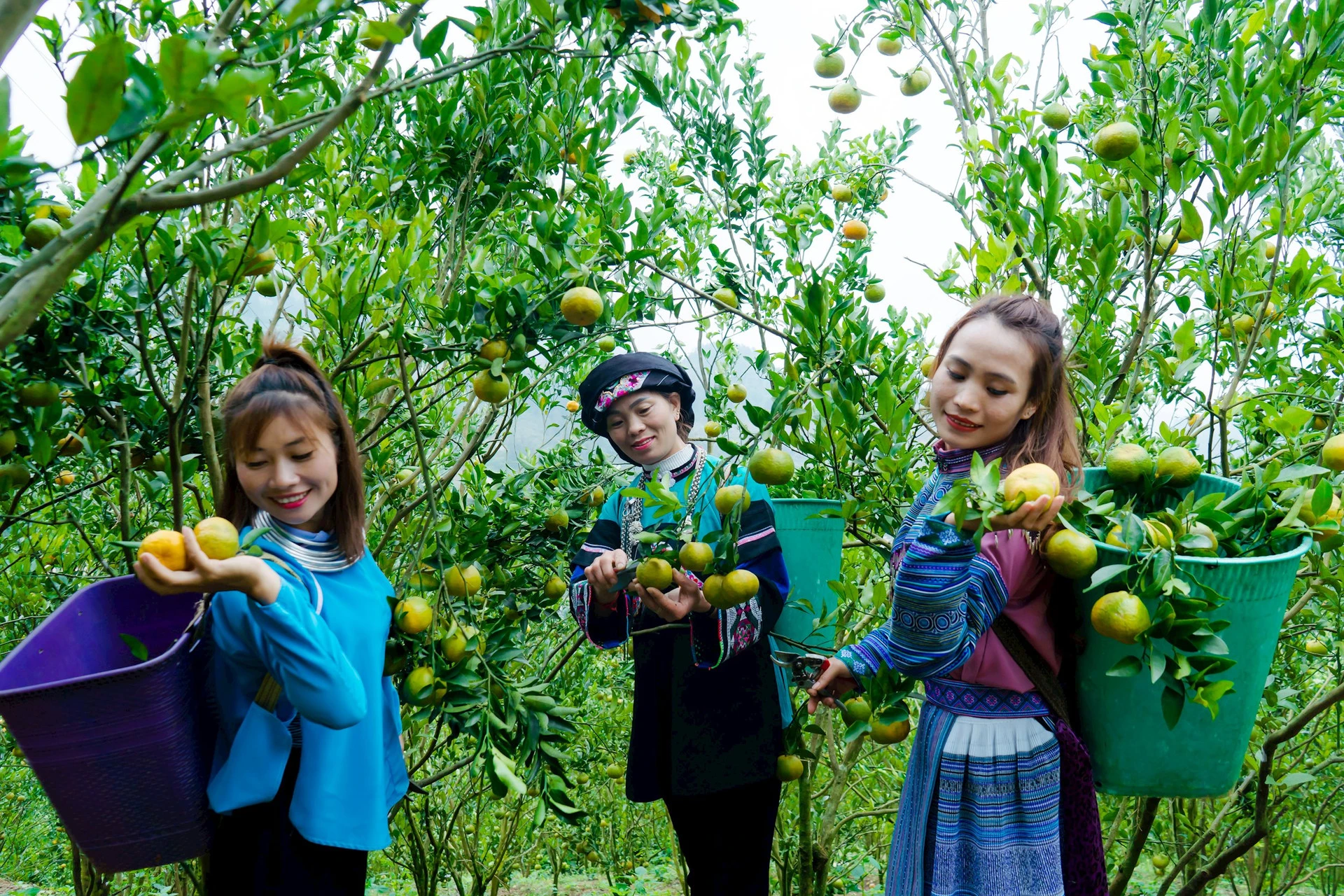 Đồng bào Mông và Bố Y thu hoạch quýt Mường Khương.
