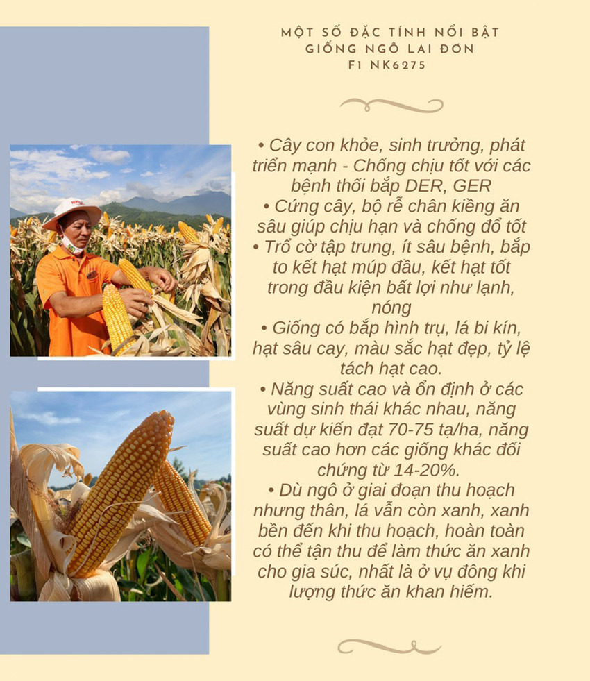 Giống ngô lai đơn F1 NK 6275 được các nhà khoa học Syngenta nghiên cứu và đưa vào Việt Nam từ năm 2015, trải qua hàng trăm cuộc khảo nghiệm, vượt qua hàng ngàn tổ hợp lai, NK6275 đã chứng minh những ưu thế vượt trội.