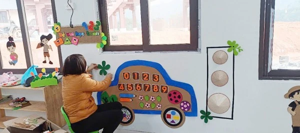 Cô giáo Hoàng Thị Hoa cho biết: “Mấy ngày qua trường đã huy động giáo viên tranh thủ thời gian trống tiết sẽ lên điểm trường của khu tái định cư để dọn dẹp và trang trí lớp cả bên trong lẫn bên ngoài. Mỗi một lớp sẽ có 6 góc chơi nên các cô sẽ trang trí theo chủ đề như góc học tập, góc tạo hình, góc học toán… Bên ngoài chúng tôi trang trí thành nhiều góc như: góc phụ huynh, góc dân tộc và thêm cả trang trí Noel”.