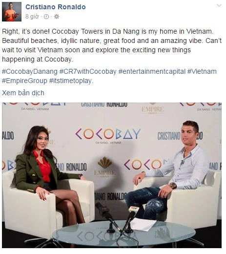Trên trang cá nhân, Ronaldo chia sẻ: "Cocobay Tower tại Đà Nẵng là ngôi nhà của tôi ở Việt Nam. Những bãi biển đẹp, thiên nhiên kỳ diệu, thức ăn ngon và những cảm xúc tuyệt vời. Tôi không thể đợi để đến thăm Việt Nam sớm và khám phá những điều mới mẻ đang diễn ra tại Cocobay".