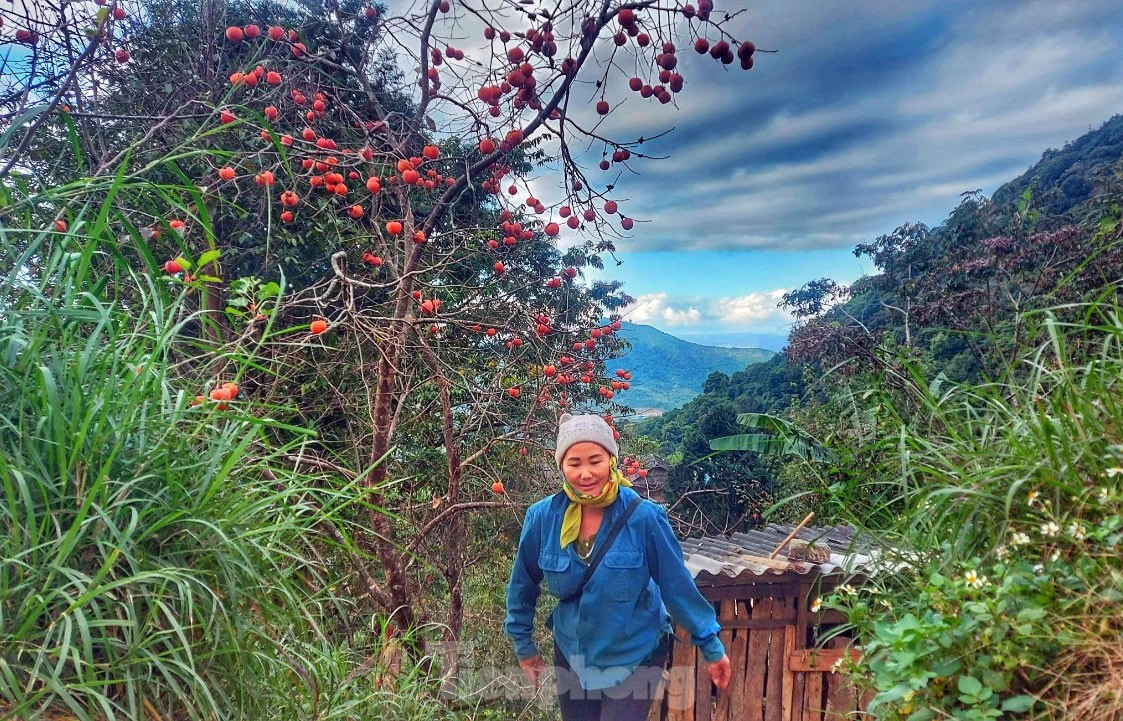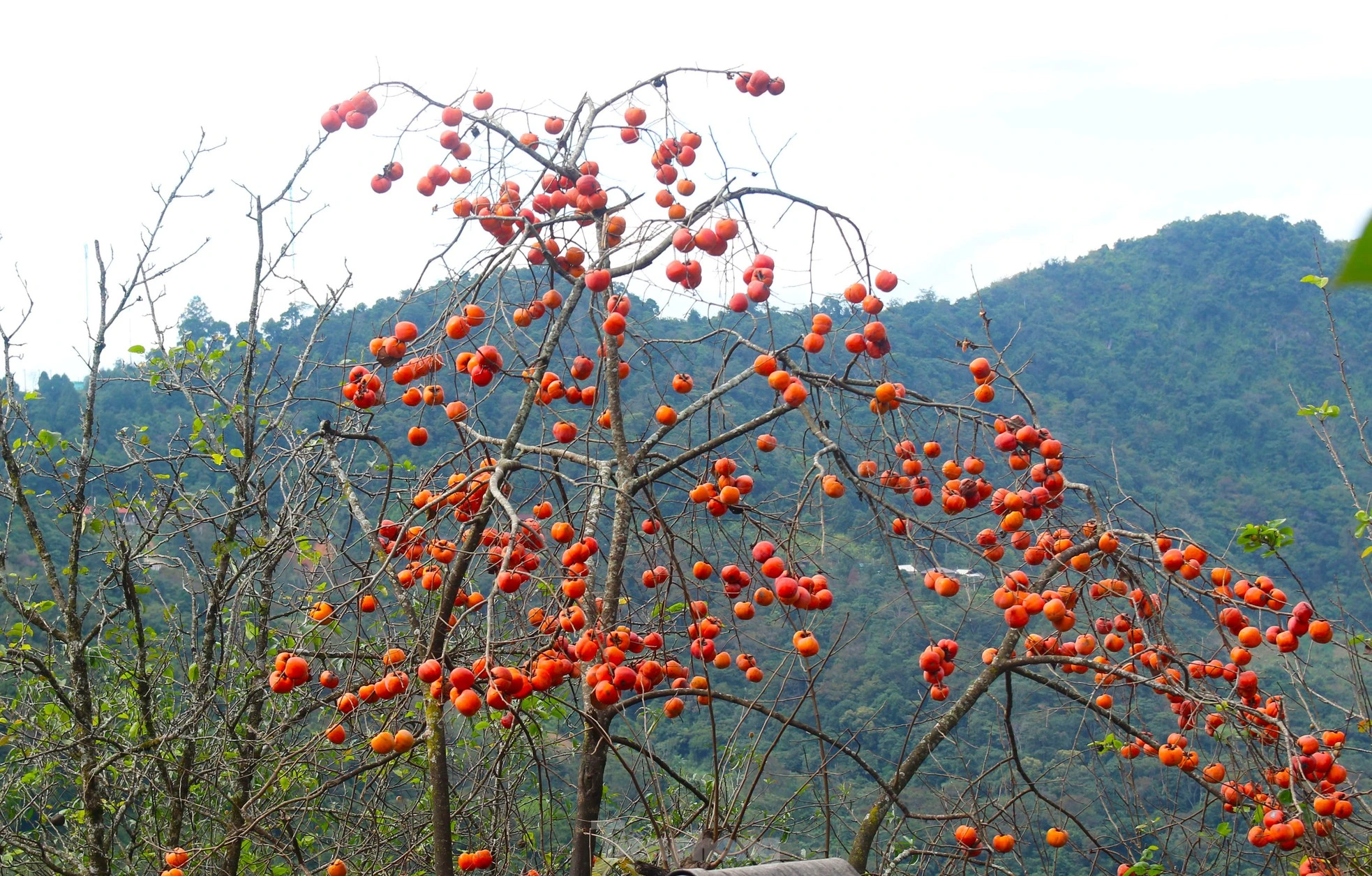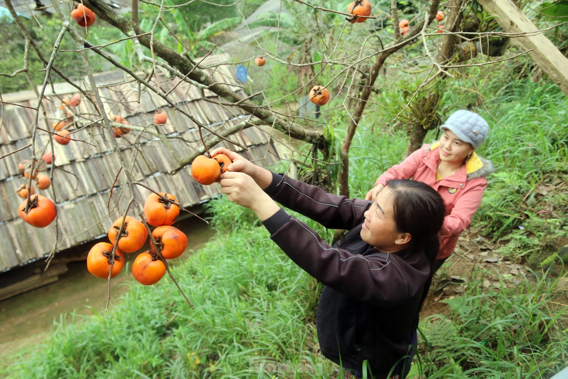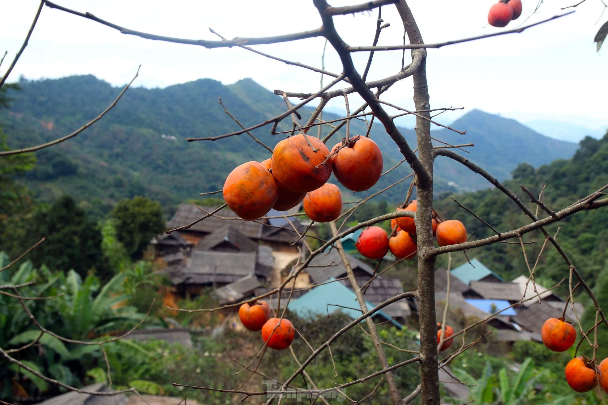 Hồng chín trùm lên mái nhà lợp bằng mái sa mu của người Mông.