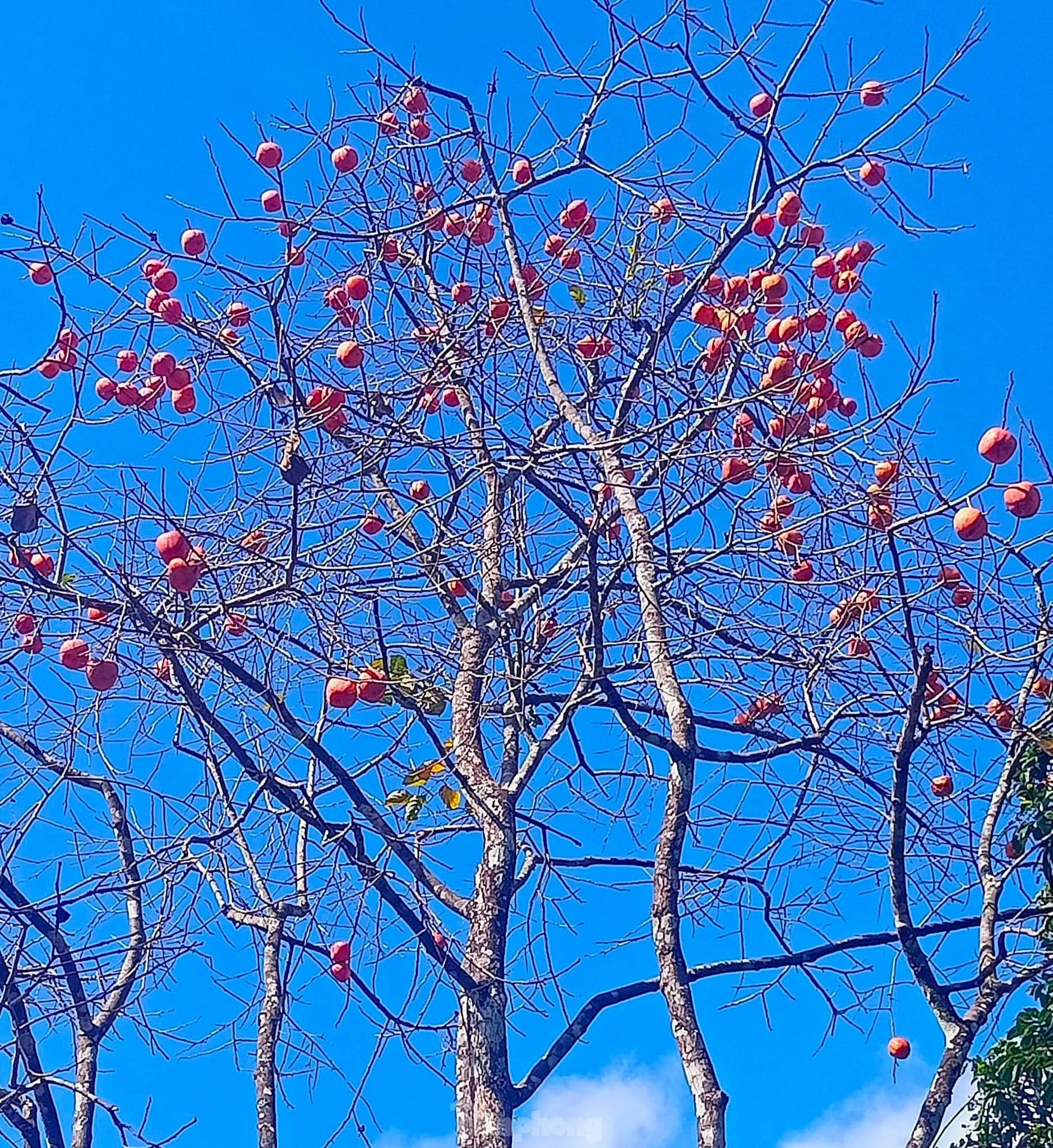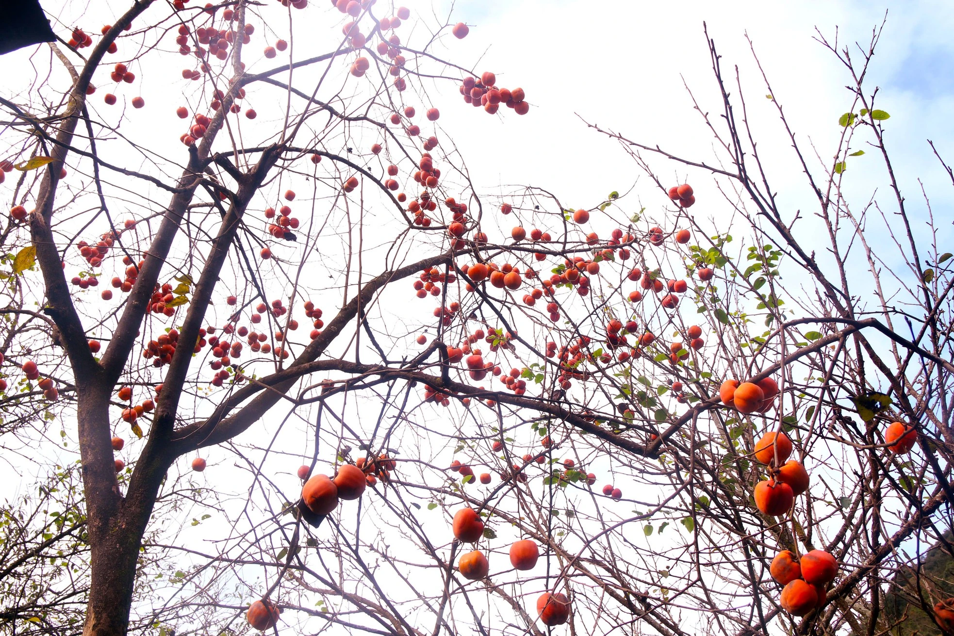 Những cây hồng rụng hết lá chỉ còn trơ lại trên cành những chùm quả chín đỏ như một bức tranh thơ mộng giữa trời đông.