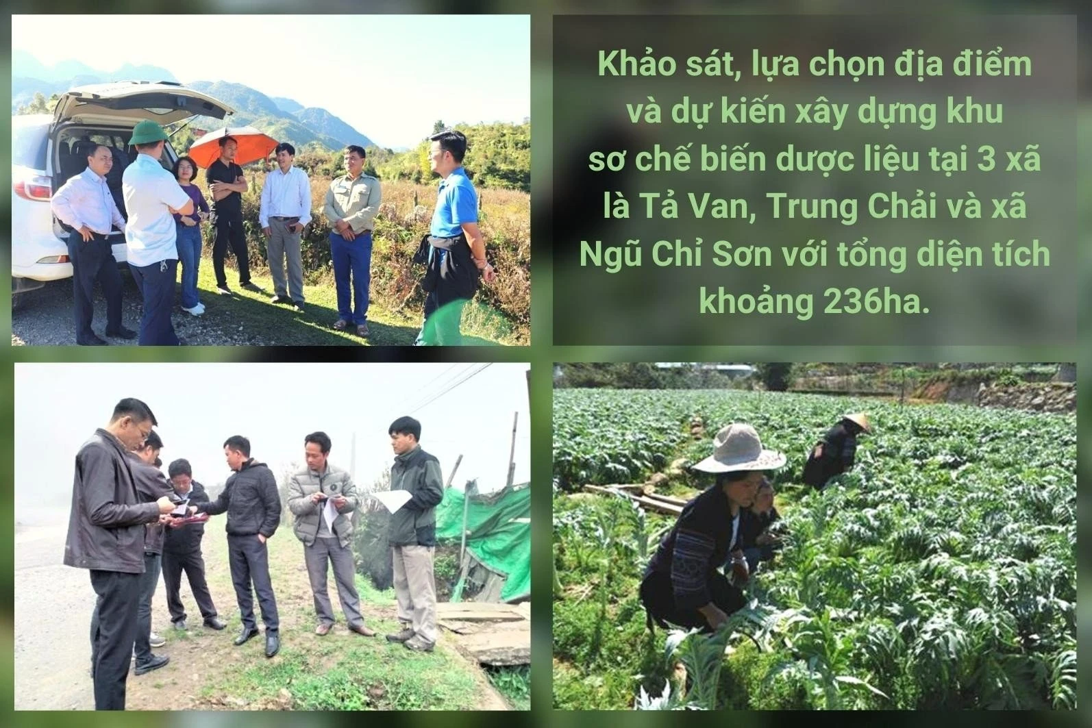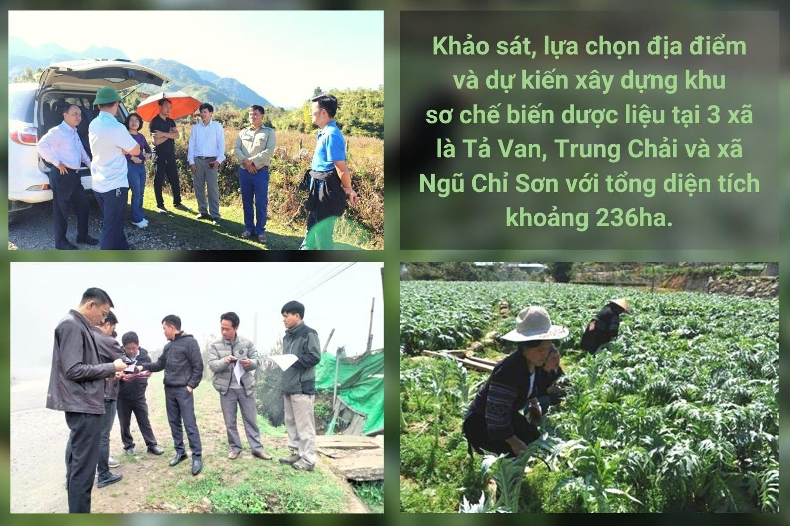 Trên cơ sở khảo sát đã lựa chọn được 8 địa phương, khu vực phù hợp để trồng 17 loài dược liệu, tại phường Hàm Rồng và các xã: Mường Bo, Liên Minh, Ngũ Chỉ Sơn, Tả Phìn, Tả Van, Thanh Bình, Trung Chải với tổng diện tích 280 ha. Lựa chọn và xây dựng mô hình khu sơ chế, chế biến dược liệu đặt tại khu nông nghiệp ứng dụng công nghệ cao thuộc thôn Cửa Cải, xã Ngũ Chỉ Sơn với diện tích khoảng 7,39 ha.