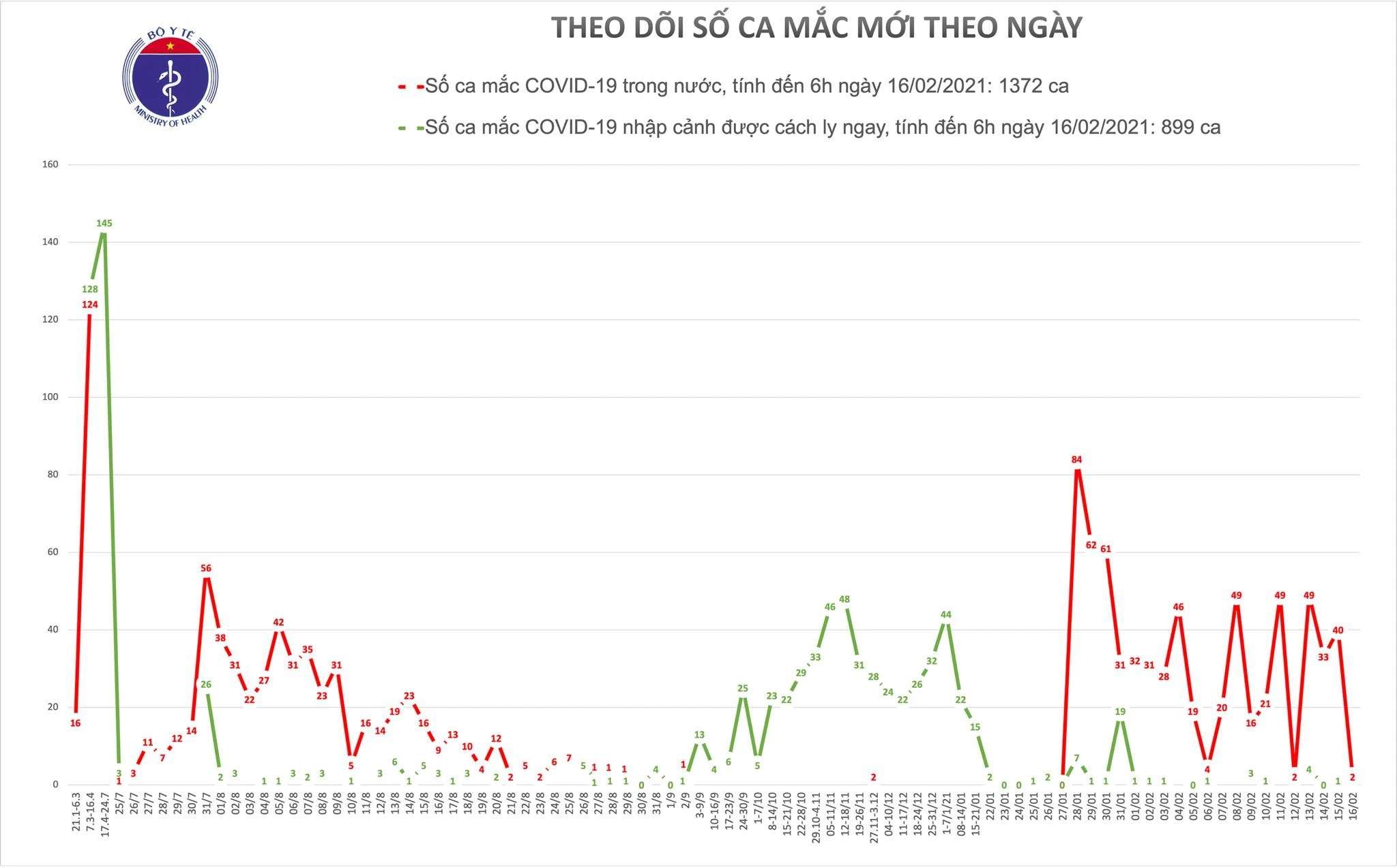 - Tính từ 18h ngày 15/02 đến 6h ngày 16/02: 2 ca mắc mới, trong đó có 0 ca nhập cảnh được cách ly ngay.