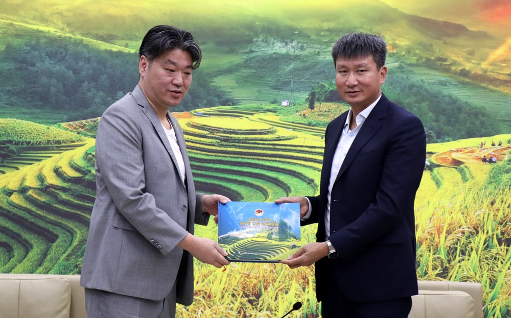 Tran Huy Tuan, Secretary of the Yen Bai Provincial Party Committee, presented Duong Thinh Xuan, Chairman of the Asia-Pacific Chamber of Commerce and Industry, with a photo book titled "Land and People of Yen Bai" during their meeting to explore investment cooperation opportunities in Yen Bai Province.