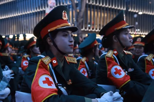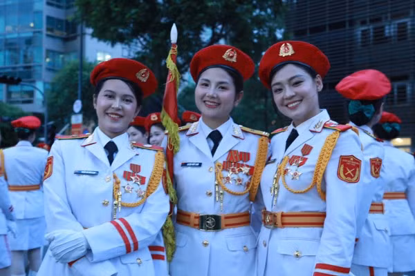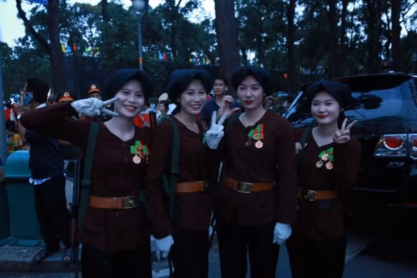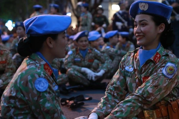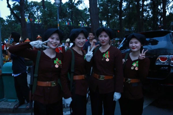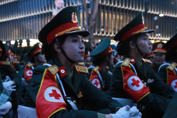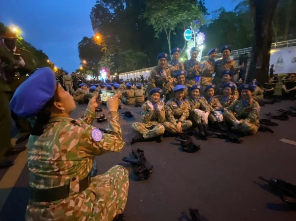 Dưới ánh đèn vàng rực của phố xá và tiếng reo hò cổ vũ của người dân đứng hai bên đường, những nữ chiến sĩ với dáng đứng ngay ngắn, hàng lối thẳng tắp, bước chân nhịp nhàng theo hiệu lệnh, tạo nên một hình ảnh đẹp vừa mạnh mẽ, vừa duyên dáng. Có người còn tranh thủ chụp nhanh vài bức ảnh kỷ niệm cùng đồng đội trước giờ vào vị trí – những khoảnh khắc giản dị nhưng đầy tự hào.