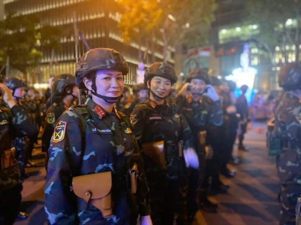 Ngay từ cuối giờ chiều, tại các tuyến đường chuẩn bị diễu hành như Lê Duẩn, Phạm Ngọc Thạch, Đồng Khởi… hàng trăm nữ chiến sĩ thuộc các lực lượng Công an, Quân đội, Dân quân tự vệ, học viện, nhà trường… đã chỉnh tề trong quân phục, tập trung chuẩn bị đội hình. Gương mặt ai nấy đều toát lên vẻ rạng rỡ, kiêu hãnh và đầy quyết tâm, sẵn sàng cho phần trình diễn quan trọng trong đêm sơ duyệt.