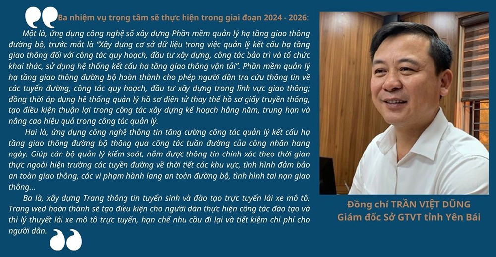 Đồng chí Trần Việt Dũng – Giám đốc Sở GTVT tỉnh Yên Bái cho biết: "Trước đây, đội ngũ cán bộ của Sở chủ yếu là các kỹ sư chuyên ngành giao thông, cầu đường, xây dựng, họ rất giỏi về năng lực chuyên môn nhưng lại hạn chế về công nghệ thông tin. Điều này gây ra nhiều khó khăn trong việc tiếp cận, tiếp nhận công nghệ, ứng dụng mới cũng như quản lý hệ thống cơ sở hạ tầng công nghệ thông tin hiện có. Thêm vào đó, nguồn lực cho đầu tư phát triển ứng dụng công nghệ thông tin, chuyển đổi số cũng còn hạn chế… Tuy nhiên, chúng tôi xác định, không thể khoanh tay bằng lòng với chuyên môn mà tất cả cán bộ, đảng viên phải xác định tinh thần đổi mới và cầu thị"