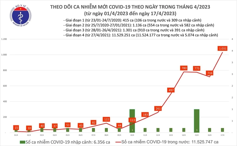 Liên quan đến công tác tiêm chủng, Bộ Y tế cho biết, trong ngày 16/4 có 159 liều vaccine phòng COVID-19 được tiêm. Như vậy, tổng số liều vaccine đã được tiêm là 266.073.566 liều. Trong đó, tiêm cho người từ 18 tuổi trở lên là 223.487.639 liều: mũi 1 là 70.907.533 liều; mũi 2 là 68.450.021 liều; mũi bổ sung là 14.370.087 liều; mũi nhắc lại lần 1 là 52.031.471 liều; ũi nhắc lại lần 2 là 17.728.527 liều.