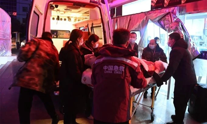 Nhân viên cứu hộ đưa nạn nhân tới bệnh viện sau trận động đất ở tỉnh Cam Túc, Trung Quốc ngày 18/12.