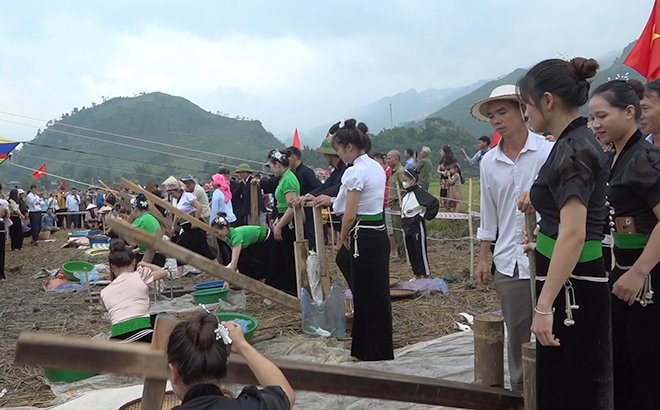 Sau lễ cúng mừng cơm mới là phần hội với phần chính là hội thi giã cốm. Hội thi giã cốm tại Lễ hội năm nay có các đội thi đến từ 9 thôn bản của xã Tú Lệ. Ngay từ sáng sớm, các cô gái và chàng trai của mỗi đội thi đã ra đồng gặt những bông lúa còn đẫm sương đêm mang về làm cốm. Sau khi chọn lúa, suốt hạt, mỗi đội có 4 thí sinh tham gia phần thi giã cốm thơm, dẻo ngon, màu sắc đẹp và thi gói cốm. Dưới bàn tay khéo léo, phối hợp nhịp nhàng của các cô gái, chàng trai các khâu chọn lúa, rang thóc, đến giã cốm đều được thể hiện thuần thục, thu hút đông đảo du khách thập phương tham quan.