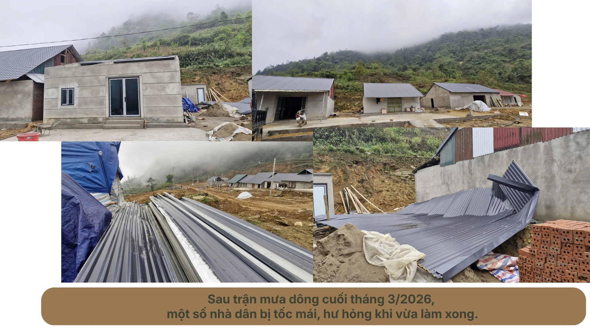 Đi thăm những hộ dân khác ở khu tái định cư Láo Vàng, chúng tôi không khỏi chạnh lòng khi thấy sau trận mưa lớn đầu mùa hệ thống mái tôn của một số ngôi nhà vừa mới lợp xong đã bị hư hỏng. Có ngôi nhà bị gió lốc mạnh cả mái bị hỏng.