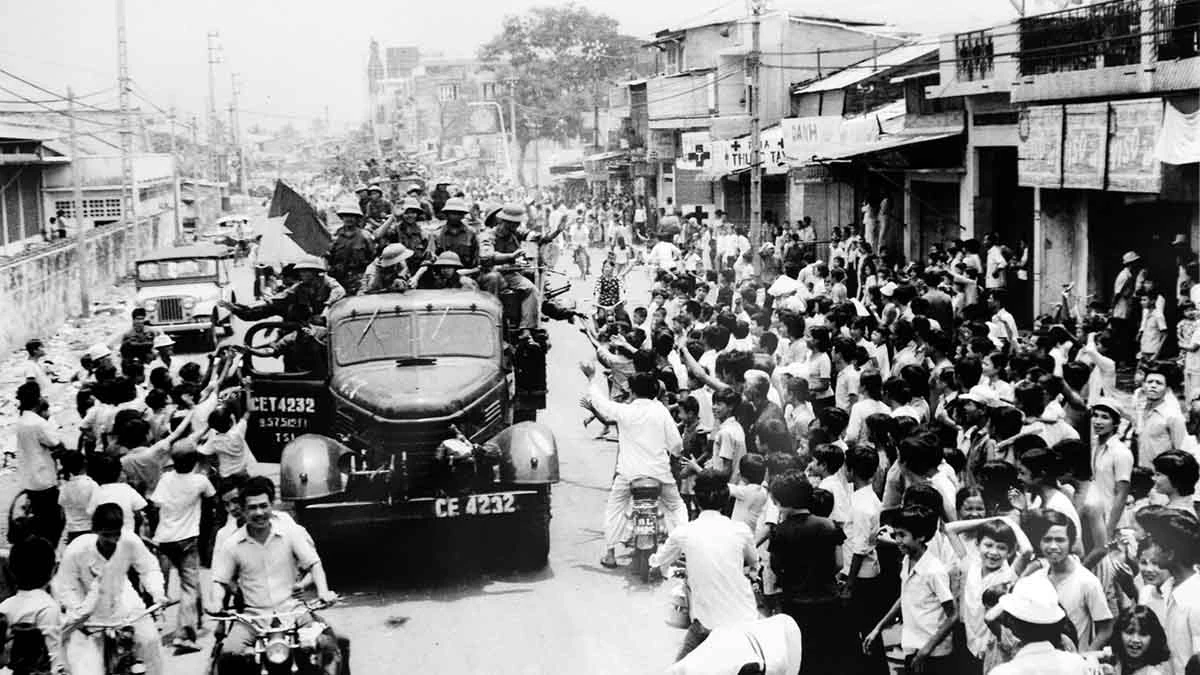 Nhân dân chào đón quân giải phóng tiến vào Sài Gòn.