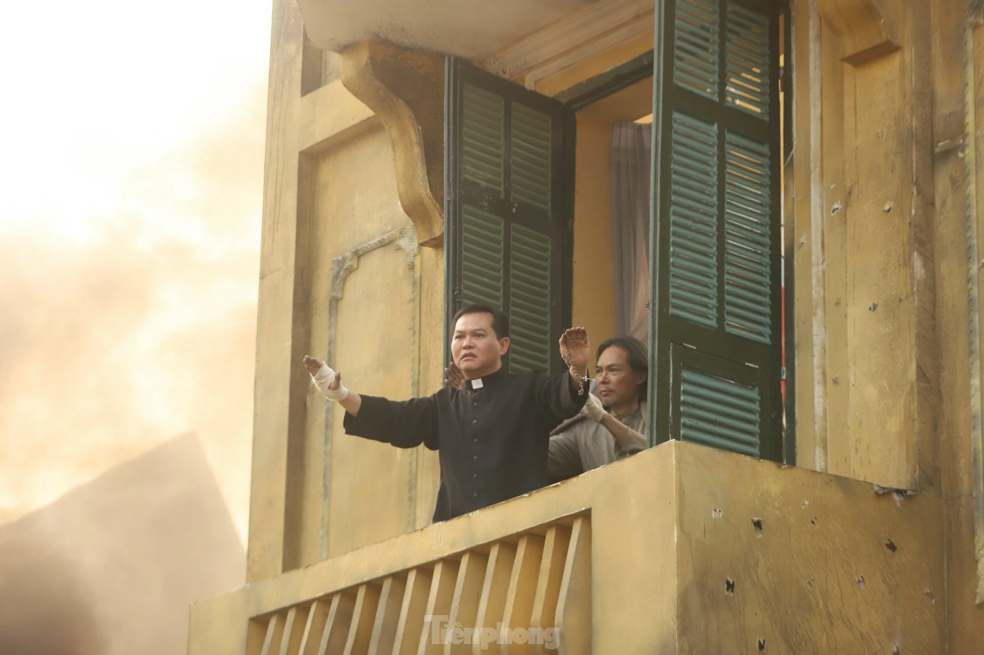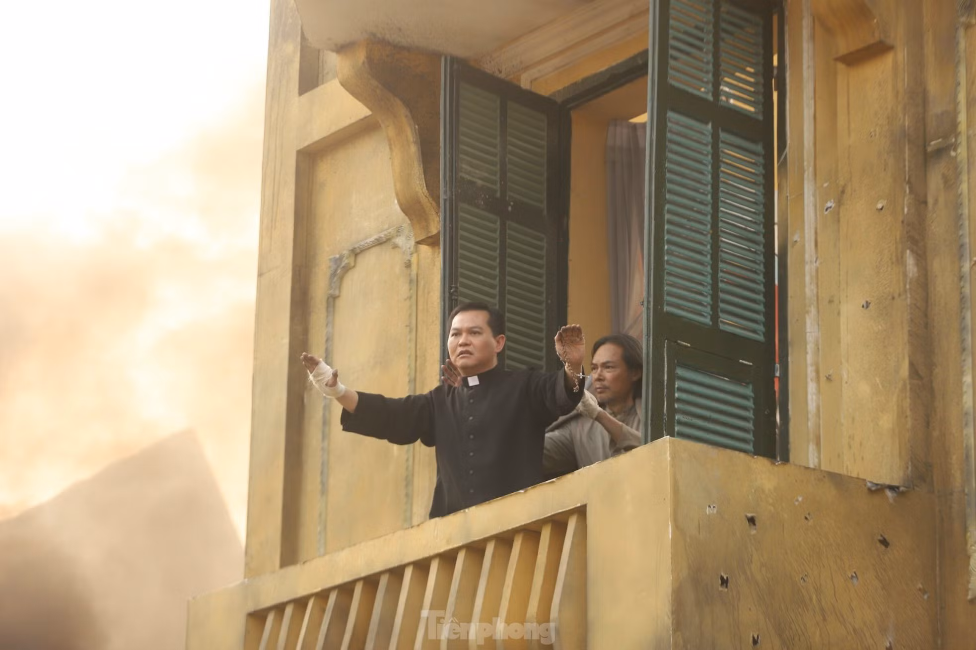 NSND Trung Hiếu vận bộ trang phục cha xứ. Anh đứng trên tầng 2 một tòa nhà, mở tung cánh cửa ra ban công hét lớn bằng tiếng Pháp: “Ne tirez pas! Ne tirez pas, s’il vous plait”. Lời thoại tiếng Pháp kêu gọi ngừng bắn này chỉ là một trong số câu thoại tiếng Pháp trong phim, đòi hỏi sự đầu tư tập luyện và sự kiên nhẫn để vượt thử thách của diễn viên.
