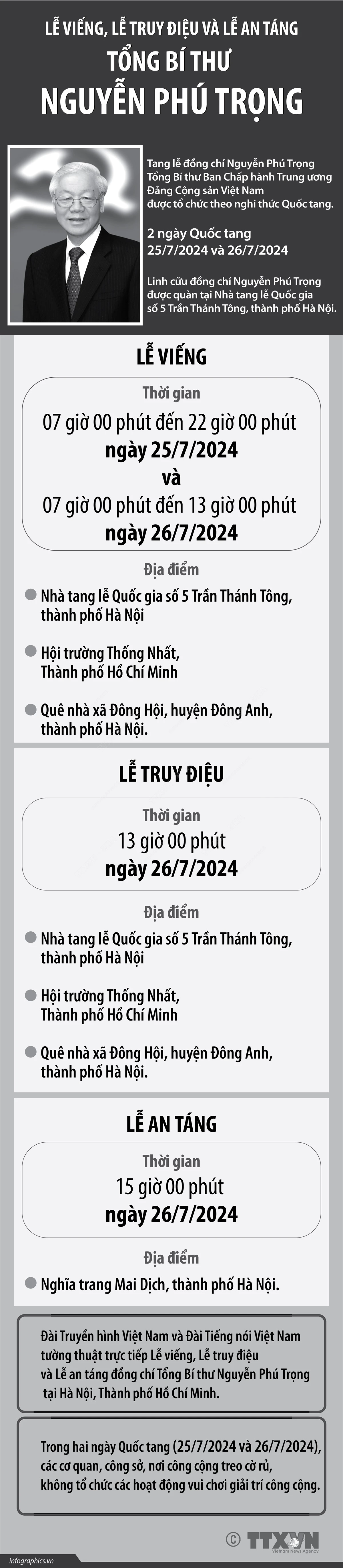 Lễ viếng đồng chí Nguyễn Phú Trọng được tổ chức tại Nhà tang lễ Quốc gia số 5 Trần Thánh Tông, thành phố Hà Nội, bắt đầu từ 07 giờ 00 phút đến 22 giờ 00 phút ngày 25 tháng 7 năm 2024 và từ 07 giờ 00 phút đến 13 giờ 00 phút ngày 26 tháng 7 năm 2024.