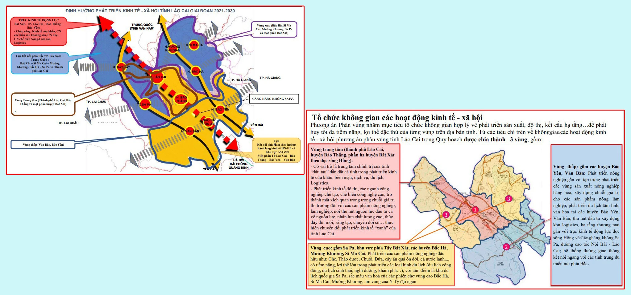 3 vùng kinh tế là: Vùng thấp gồm các huyện Văn Bàn, Bảo Yên, tập trung phát triển các vùng sản xuất nông nghiệp hàng hóa, xây dựng chuỗi giá trị sản phẩm nông, lâm nghiệp; phát triển du lịch tâm linh, văn hóa; thu hút đầu tư xây dựng khu logistics, hạ tầng thương mại gắn với trục kinh tế động lực dọc sông Hồng và cảng hàng không Sa Pa, đường cao tốc Nội Bài - Lào Cai; phát triển các khu công nghiệp trên địa bàn vùng. Vùng cao gồm các huyện Bắc Hà, Si Ma Cai, Mường Khương, thị xã Sa Pa, phần phía Tây huyện Bát Xát phát triển các sản phẩm nông nghiệp đặc hữu ôn đới; phát triển các loại hình du lịch với tâm điểm là khu du lịch quốc gia Sa Pa, vùng cao Bắc Hà, Si Ma Cai, Mường Khương, Bát Xát; thực hiện chính sách an sinh, xã hội, giảm nghèo bền vững, ổn định đời sống nhân dân các dân tộc, giữ vững chủ quyền biên giới quốc gia. Vùng trung tâm gồm thành phố Lào Cai, huyện Bảo Thắng, phần hạ huyện Bát Xát theo dọc sông Hồng tập trung phát triển kinh tế cửa khẩu, biên mậu, dịch vụ, du lịch, logicstics, công nghiệp chế tạo, chế biến công nghệ cao, trở thành mắt xích quan trọng trong chuỗi giá trị thị trường sản phẩm nông, lâm nghiệp; nơi thu hút nguồn lực đầu tư cả về nguồn lực, nhân lực chất lượng cao, thúc đẩy đổi mới, sáng tạo, chuyển đổi số, thực hiện chuyển đổi phát triển kinh tế “xanh” của tỉnh Lào Cai.