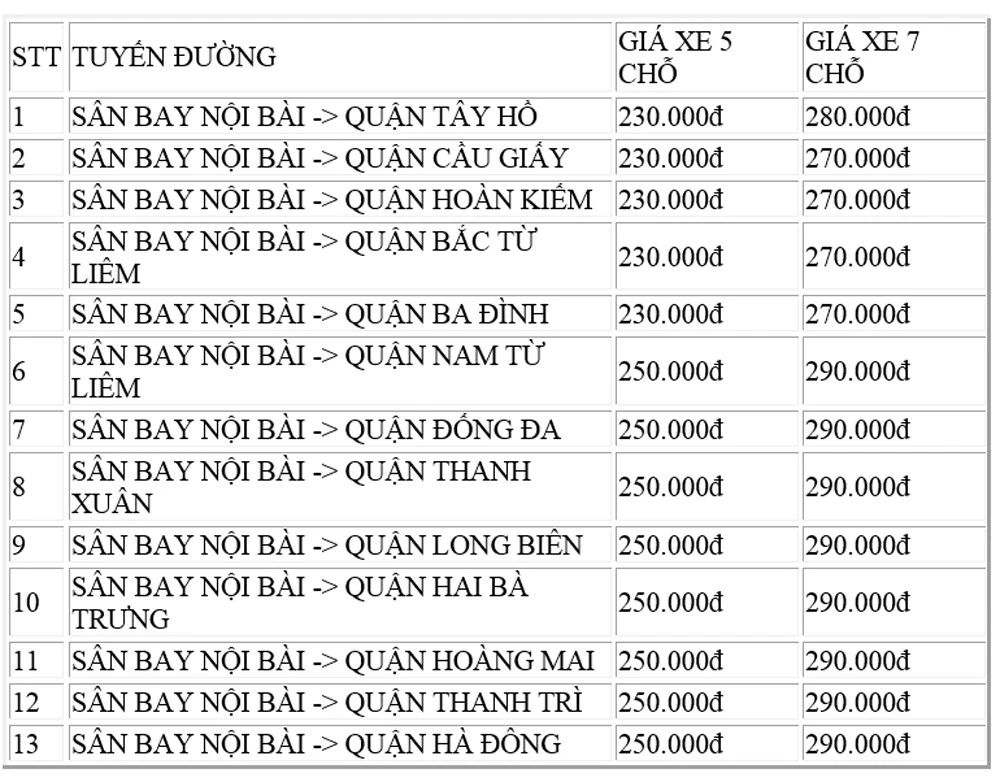 BẢNG GIÁ TAXI TỪ SÂN BAY NỘI BÀI VỀ HÀ NỘI