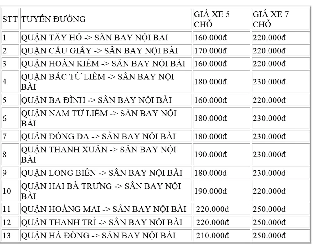 BẢNG GIÁ TAXI TỪ HÀ NỘI LÊN SÂN BAY NỘI BÀI
