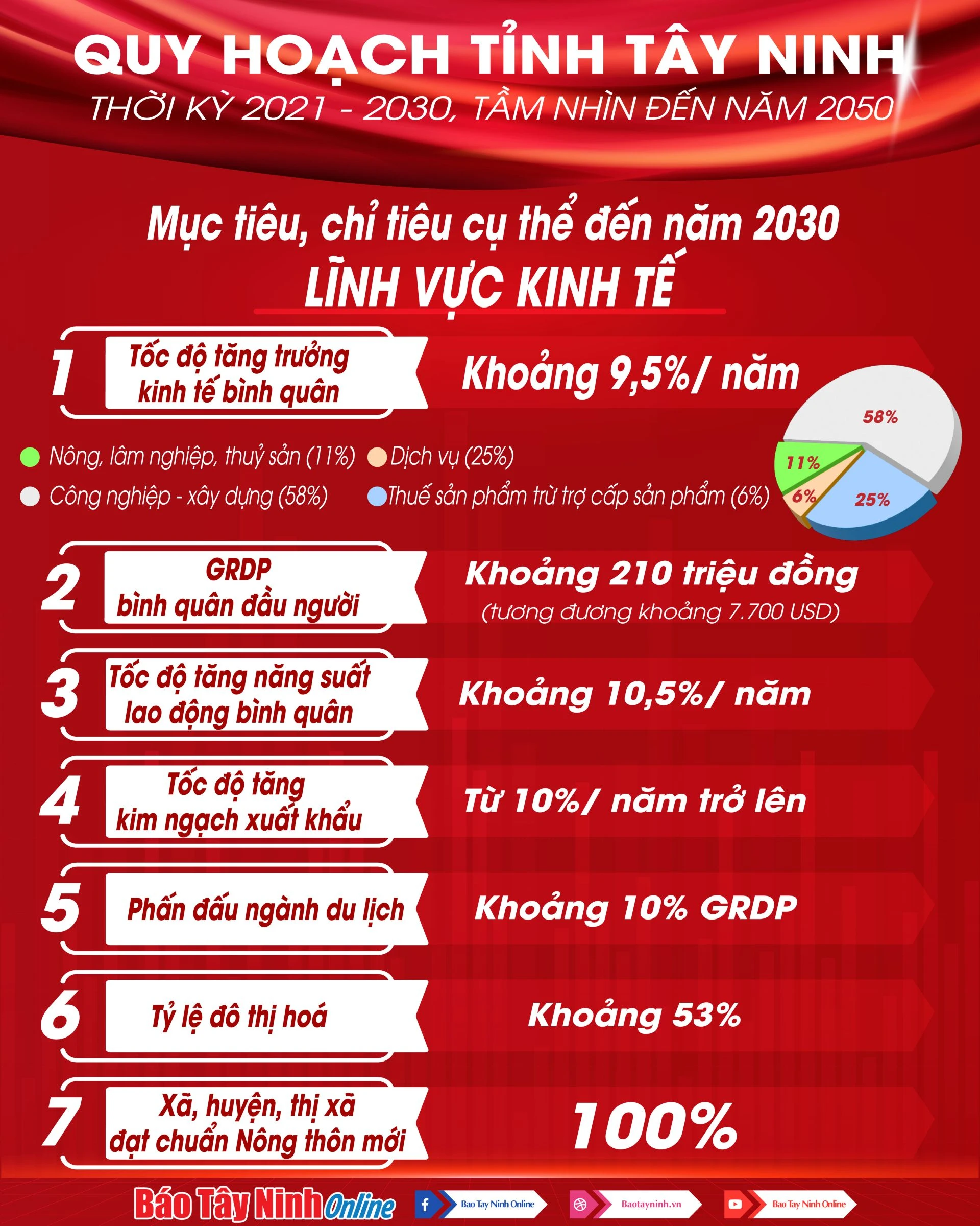 Quy hoạch tỉnh Tây Ninh đặt mục tiêu đến năm 2030, Tây Ninh phấn đấu trở thành địa phương phát triển năng động, văn minh, có môi trường sống tốt, thích ứng tốt với biến đổi khí hậu, trở thành địa phương đáng đến và đáng sống. Tầm nhìn đến năm 2050, Tây Ninh trở thành tỉnh có nền kinh tế phát triển dựa vào công nghiệp sạch và nông nghiệp công nghệ cao; thương mại, du lịch phát triển và là cửa ngõ thương mại quốc tế của vùng Đông Nam Bộ và cả nước. Là tỉnh có hệ thống quản trị công hiệu quả, môi trường kinh doanh thân thiện, môi trường sống hấp dẫn dựa trên một hệ sinh thái bền vững và đa dạng.