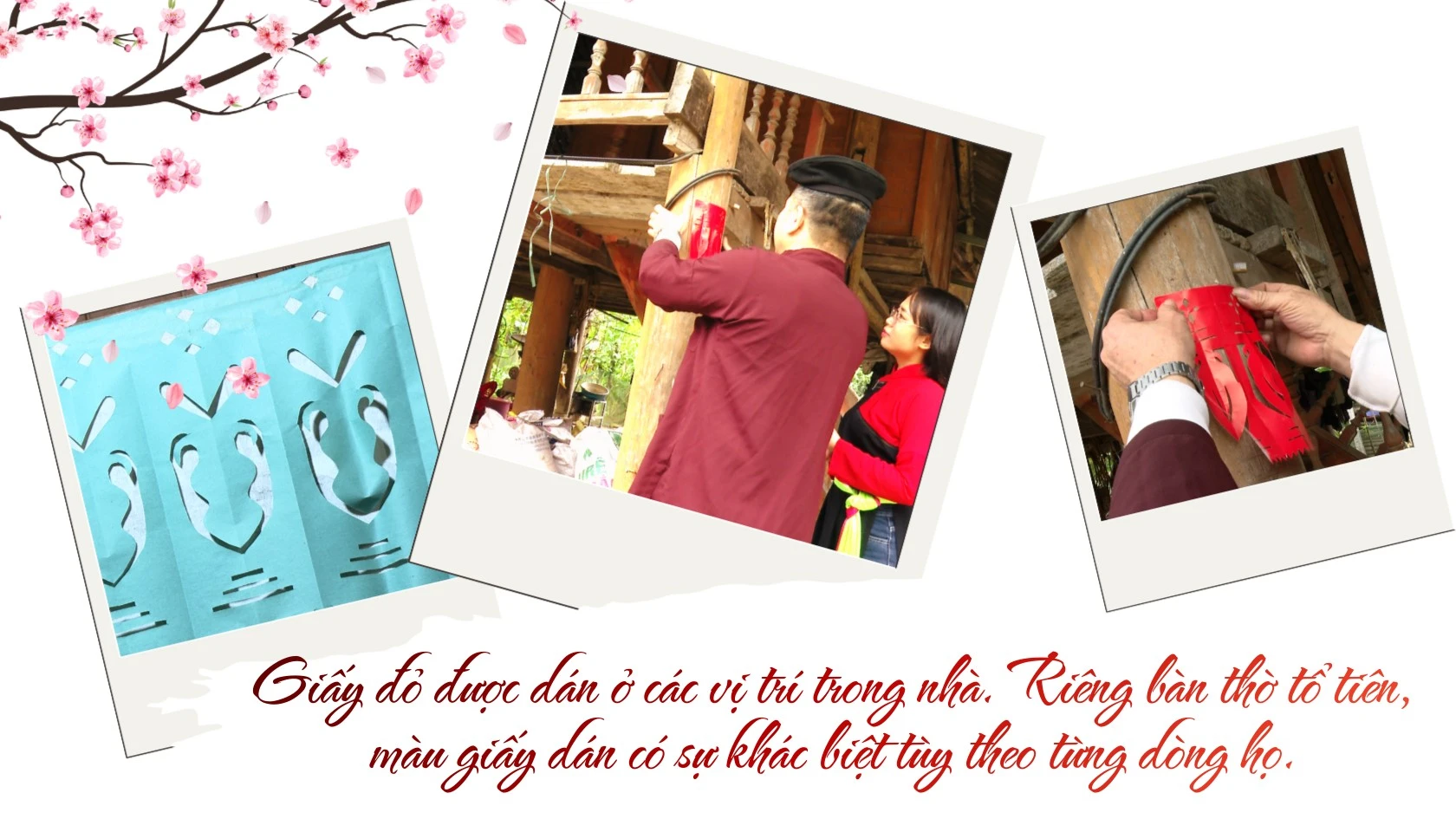 Vào khoảng ngày 28, 29 tháng Chạp, hầu hết vật dụng gắn liền với đời sống sản xuất và sinh hoạt trong các gia đình đều được dán giấy đỏ như: cửa nhà, cổng, cối xay, dao, cuốc, cày, chuồng gia súc và cả những cây ăn quả trong vườn... Toàn bộ ngôi nhà và khu vườn như được “khoác” lên mình sắc đỏ rực rỡ, báo hiệu mùa xuân đã về.
