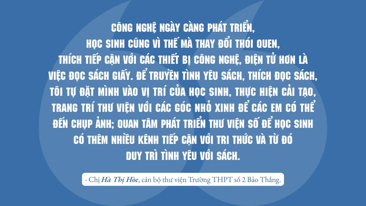 Theo xu hướng chuyển đổi số, chị Hòe dành trọn 2 năm miệt mài nghiên cứu phần mềm, số hóa tài liệu, từng bước hiện đại hóa thư viện theo hướng thân thiện – thông minh. Đến nay, thư viện Trường THPT số 2 Bảo Thắng đã có hơn 7.000 đầu sách, được trang bị đầy đủ bàn ghế, máy chiếu, wifi, góc tra cứu tài liệu số và đảm bảo các hoạt động đọc, học theo Thông tư 16/2022. Đây cũng là thư viện trường THPT đầu tiên trong tỉnh được công nhận đạt chuẩn mức độ 2.
