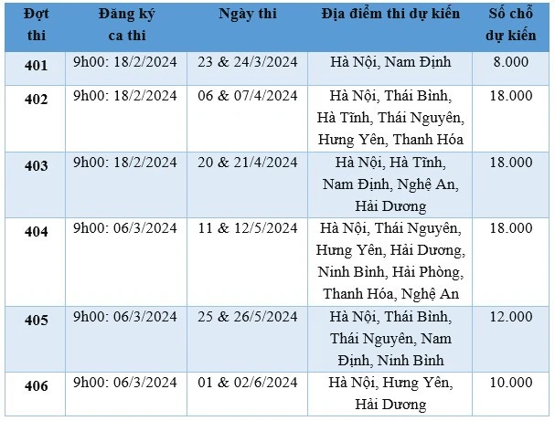 Đến thời điểm này, tất cả địa điểm thi đánh giá năng lực đều đảm bảo đáp ứng các yêu cầu đề ra. Năm 2024, Đại học Quốc gia Hà Nội dự kiến tổ chức 6 đợt thi Đánh giá năng lực. Đợt thi đầu tiên vào ngày 23/3, đợt cuối cùng vào ngày 2/6, diễn ra tại 17 cơ sở giáo dục đào tạo thuộc 11 tỉnh thành. Điểm xa nhất là Hà Tĩnh. Các đợt đăng ký diễn ra từ ngày 18/2 đến 6/3 để phục vụ thí sinh tham gia dự thi.