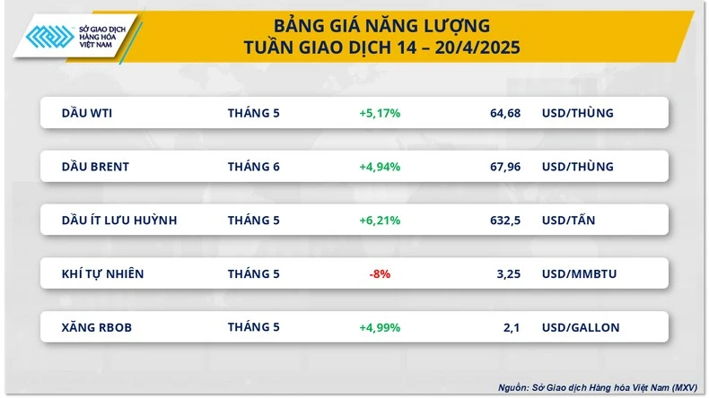 Theo ghi nhận của MXV, thị trường năng lượng tiếp tục gây chú ý khi dẫn dắt đà tăng của toàn thị trường. Giá của 4 trên 5 mặt hàng đồng loạt tăng mạnh từ 4-6% so với tuần trước. Trong đó, hai mặt hàng dầu thô cùng tăng khoảng 5% trong bối cảnh thị trường dần thích ứng với các chính sách thuế quan mới của Mỹ và những lo ngại về nguồn cung từ cuối tháng 3 đã quay trở lại.