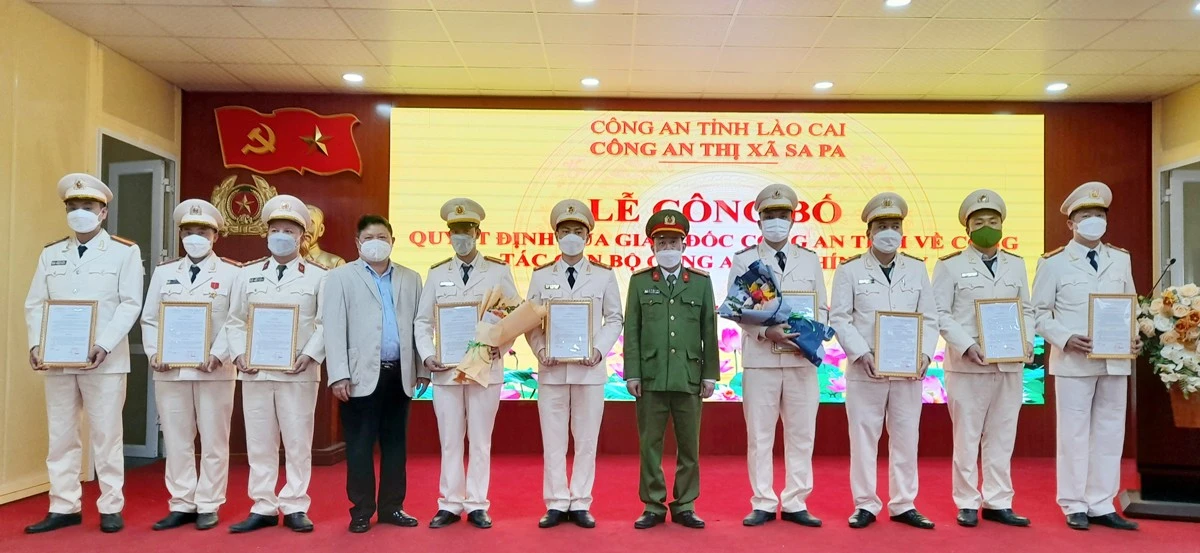 Buổi lễ đã công bố và trao Quyết định của Bộ trưởng Bộ Công an về tổ chức công an xã chính quy và công bố Quyết định của Giám đốc Công an tỉnh về tổ chức bộ máy, bố trí cán bộ công an chính quy cho 40 cán bộ, chiến sỹ tại 7 xã, phường còn lại của thị xã Sa Pa (ảnh trên). (Trước đó, Công an thị xã Sa Pa đã công bố quyết định về tổ chức công an xã chính quy đối với 15 cán bộ, chiến sỹ của 3 xã là Trung Chải, Tả Van và Bản Hồ).