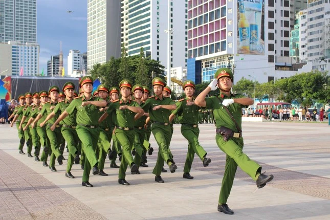 Lực lượng công an (ảnh trên) và dân quân tự vệ diễu hành tại Lễ Thượng cờ.